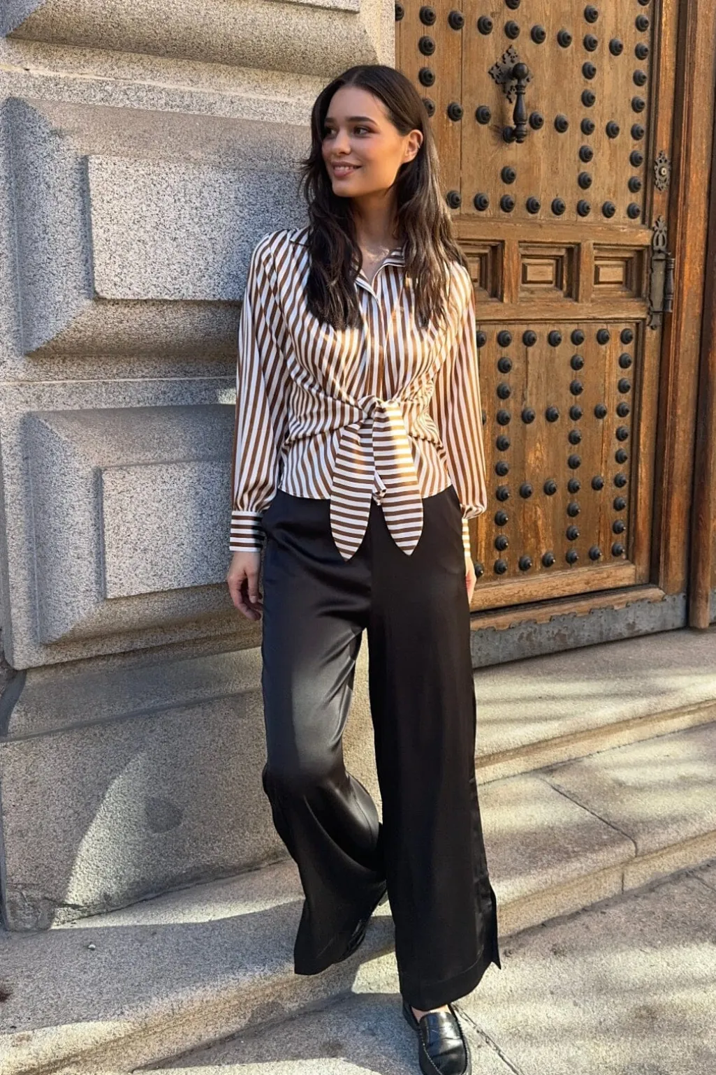 Stribet skjorte med brune og hvide striber. Skjorten har en klassisk krave, lange ærmer med manchetter og et bånd ved taljen, der kan bindes.