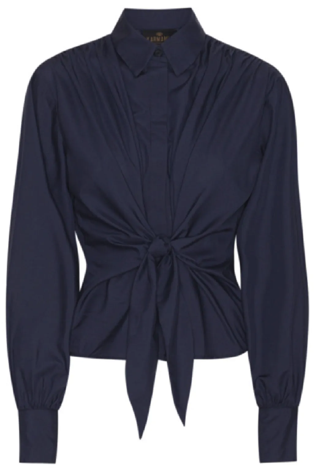 Mørkeblå skjorte med bindedetalje foran. Skjorten har lange ærmer og en klassisk skjortekrave, der giver den et rent udtryk.