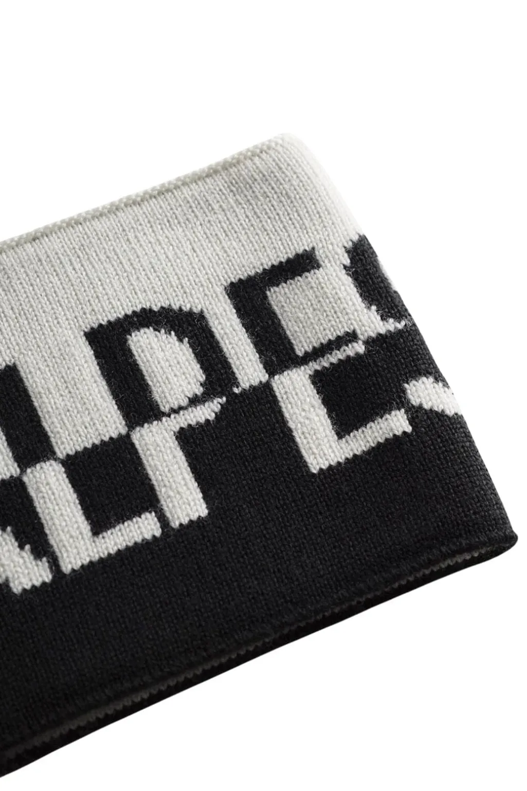 Sort pandebånd fra Twist & Tango, lavet af 100 % ekstra fin mulesing-fri merinould. Pandebåndet har teksten LES ALPES i sort og hvid.