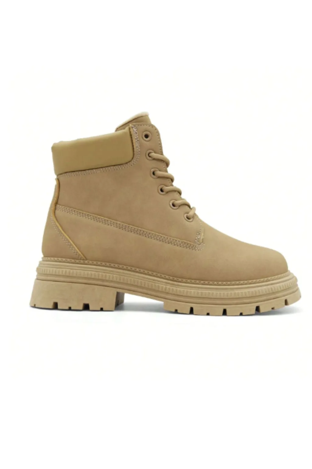 Støvler fra Bloom i taupe PU-materiale med synlige syninger og polstret krave. Støvlen har en rillet sål og en praktisk blokhæl, der er lavere end 5 cm.