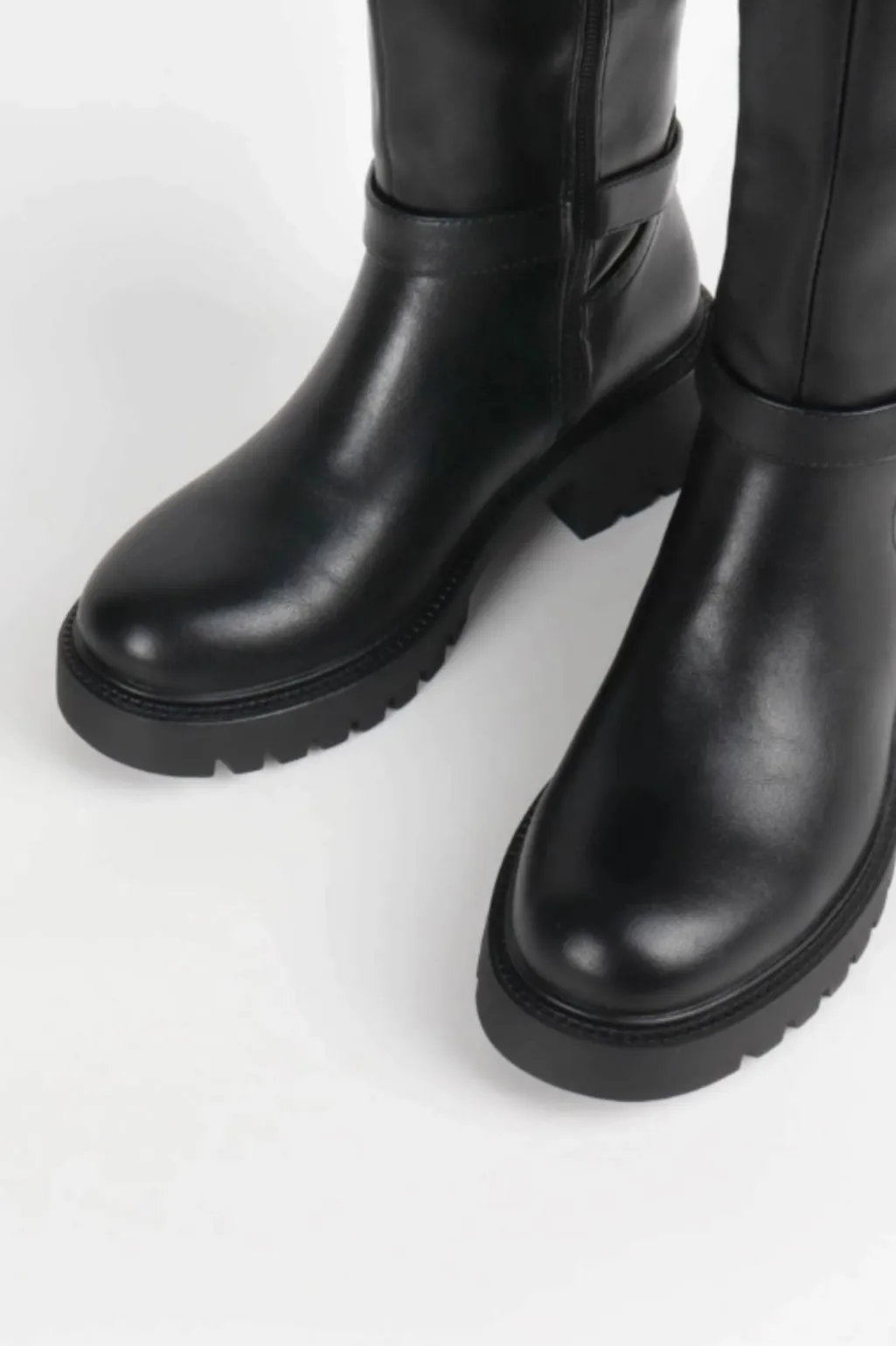 Sorte støvler fra Bloom i syntetisk materiale. Støvlerne har en blokhæl og en rund tå. På bagsiden af skaftet sidder et ribbet design, mens en rem med metalspænde pryder anklen.