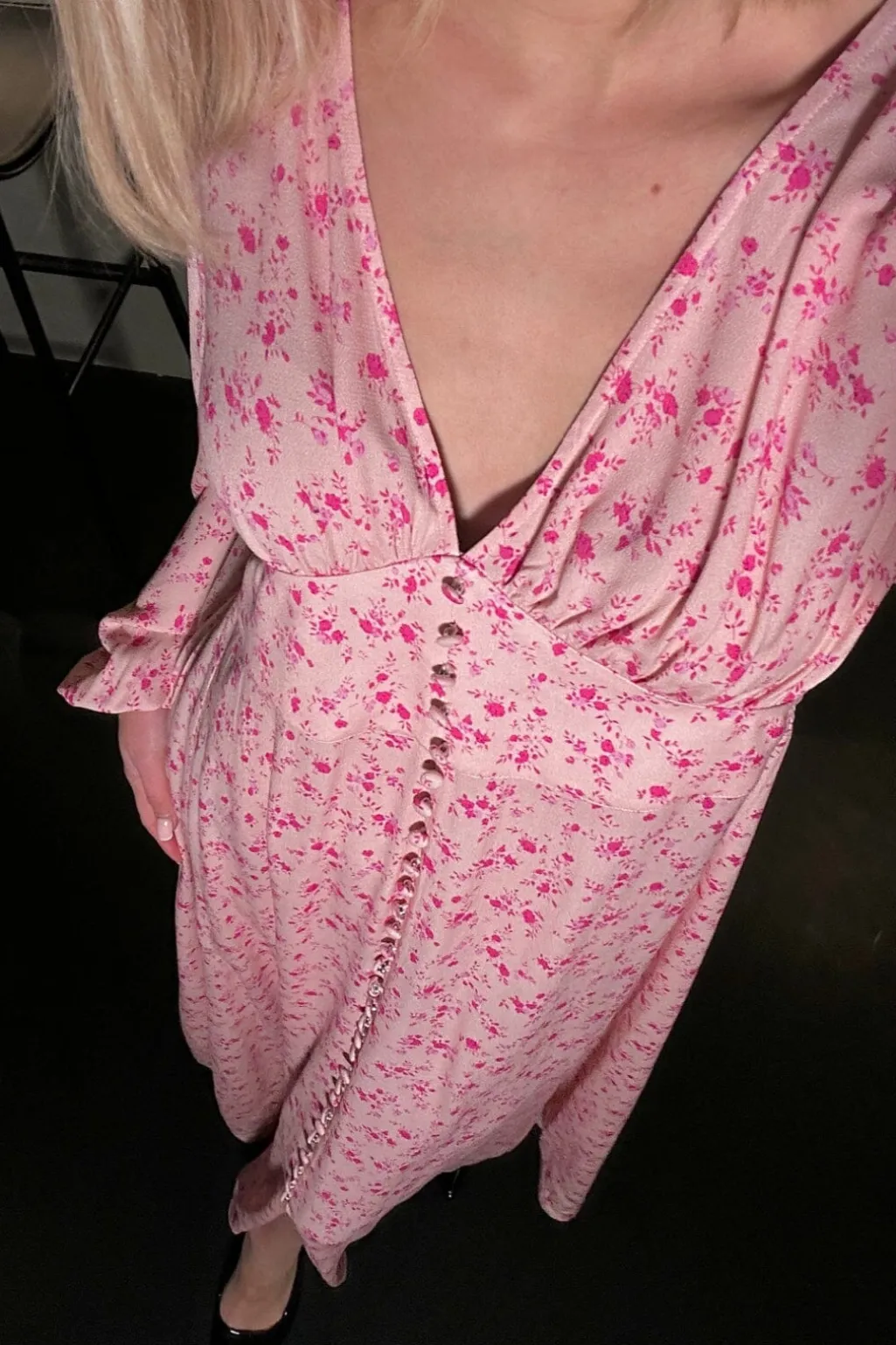 Maxikjole fra Noella med blomsterprint i lyserød. V-udskæring og lange ærmer giver kjolen et rent udtryk, mens knapperne ned langs forsiden skaber en fin detalje.