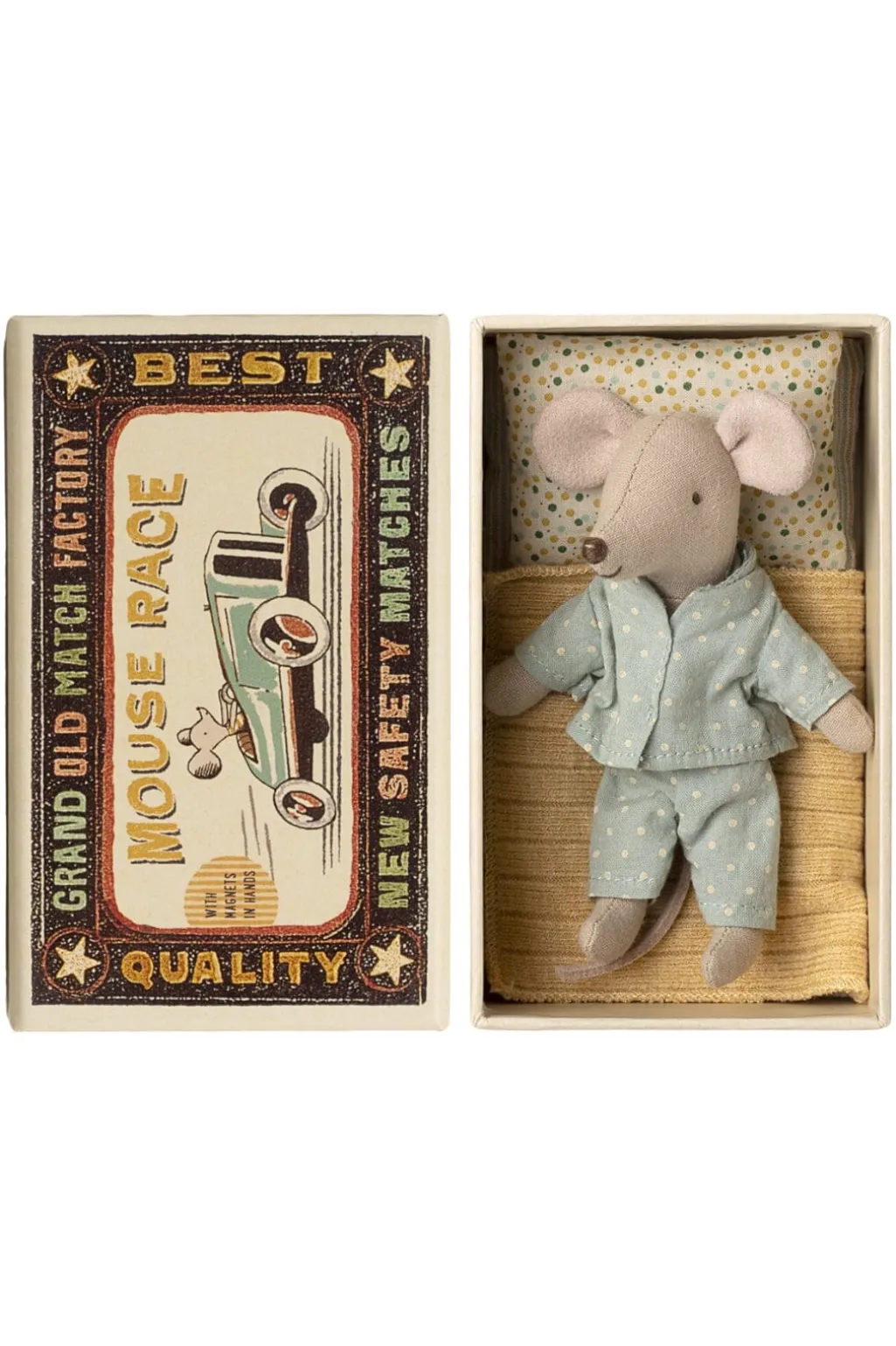 En musedukke fra Maileg i en tændstikæske med pyjamas i lyseblåt stof med hvide prikker og sengetøj i blødt stof.