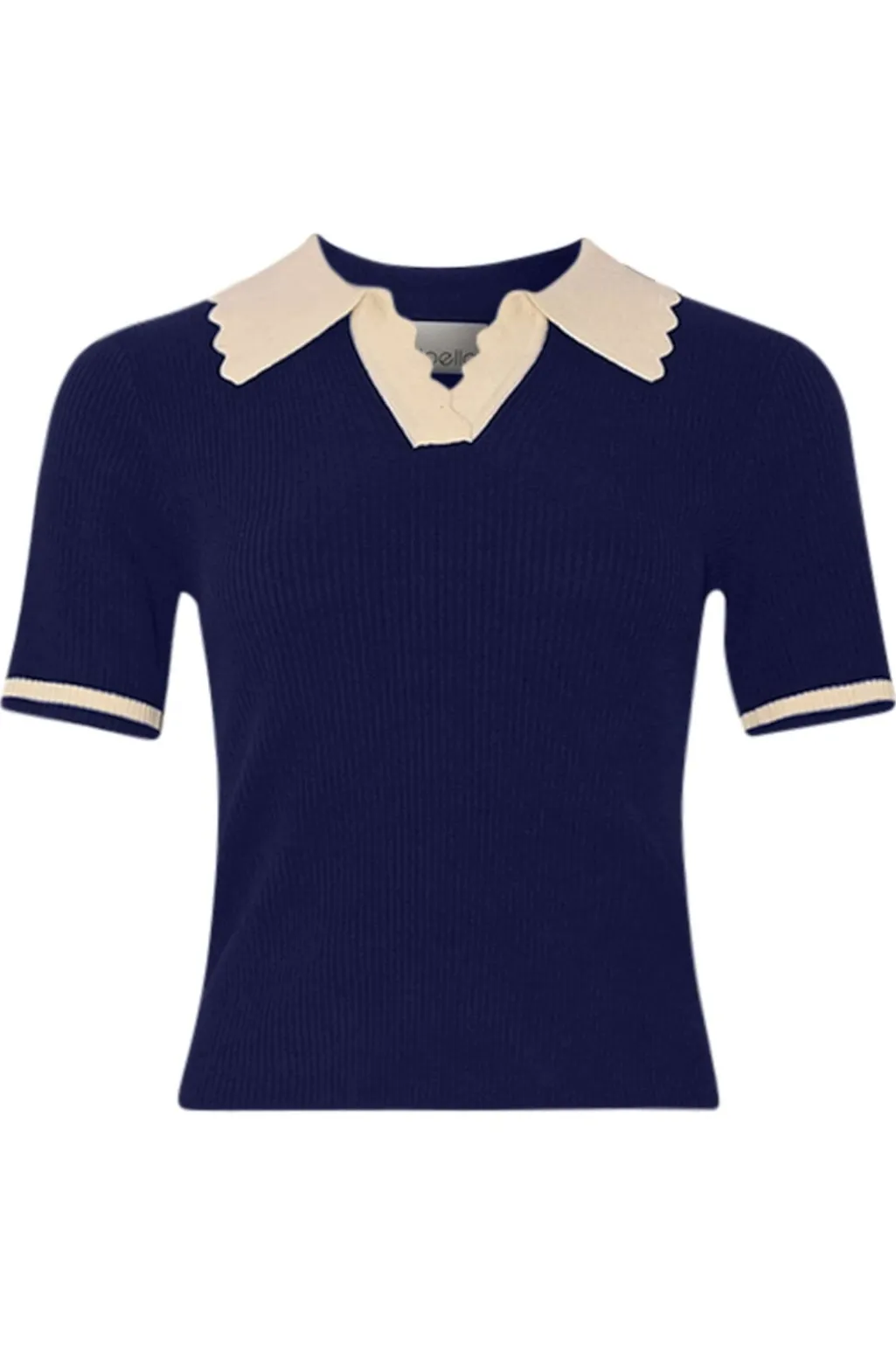 Kortærmet polo-strik fra Noella i mørkeblå farve med hvid krave. Lavet af 100 % viskose med en slim pasform.