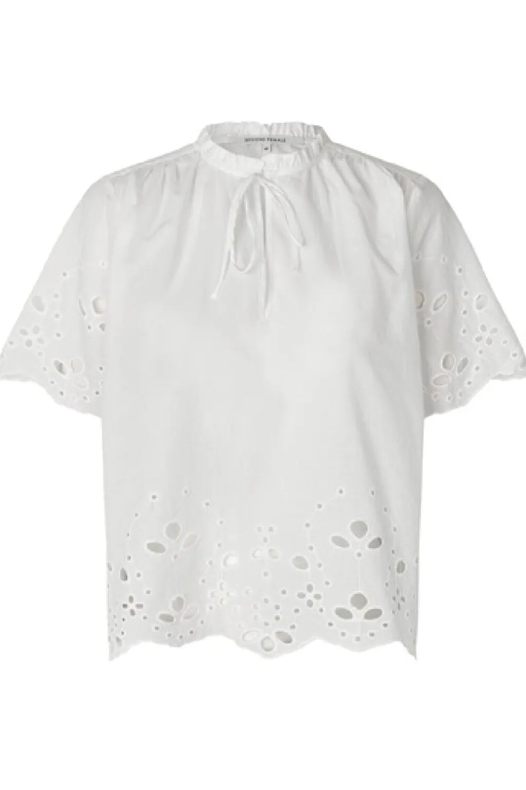 Hvid bluse fra Second Female med broderede blomstermønstre langs kanten. Blusen har korte ærmer og en V-halsudskæring med snøredetalje.