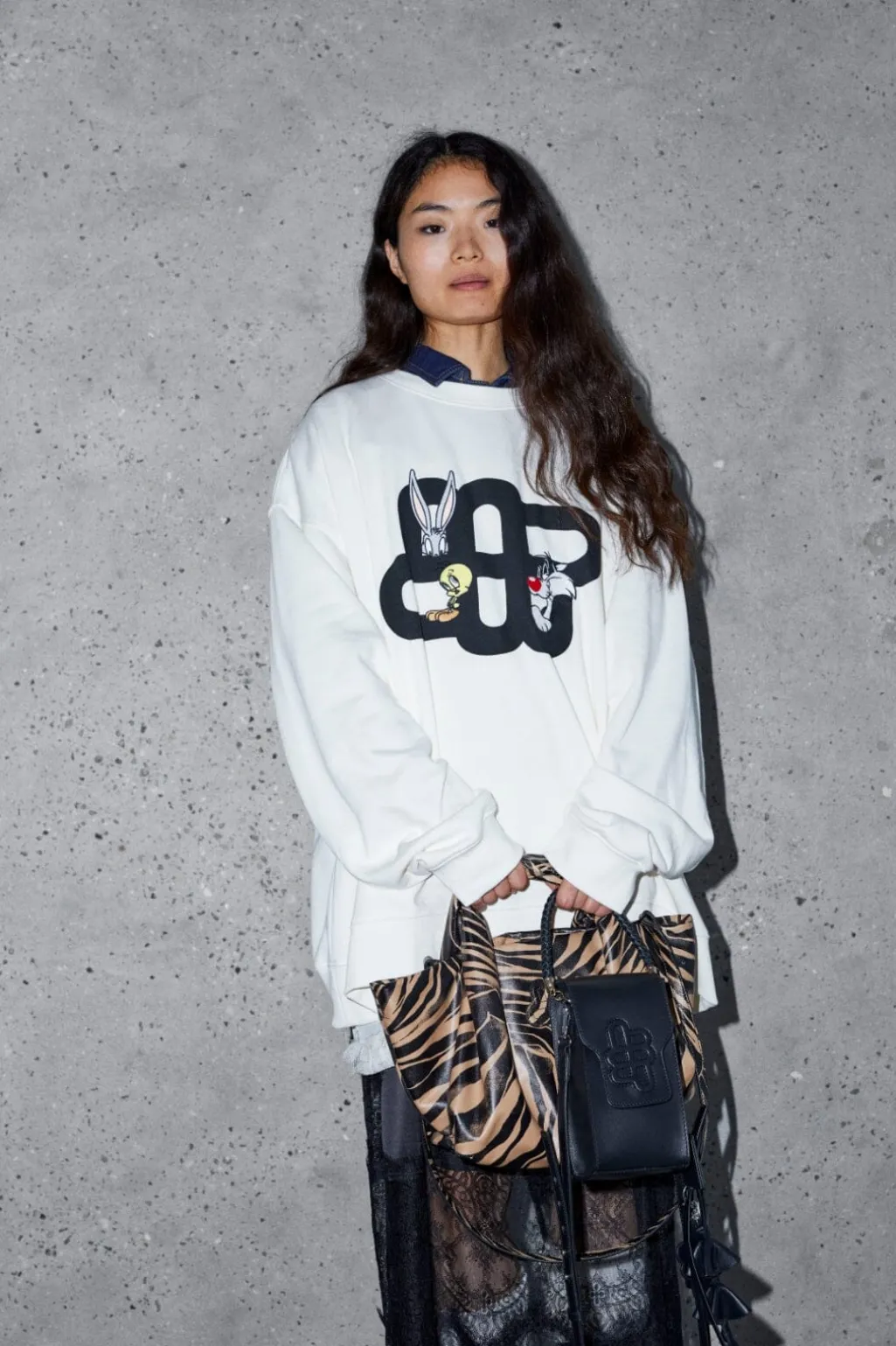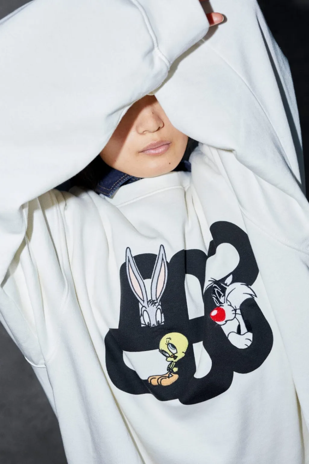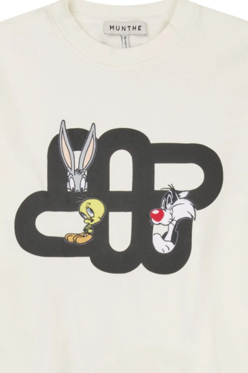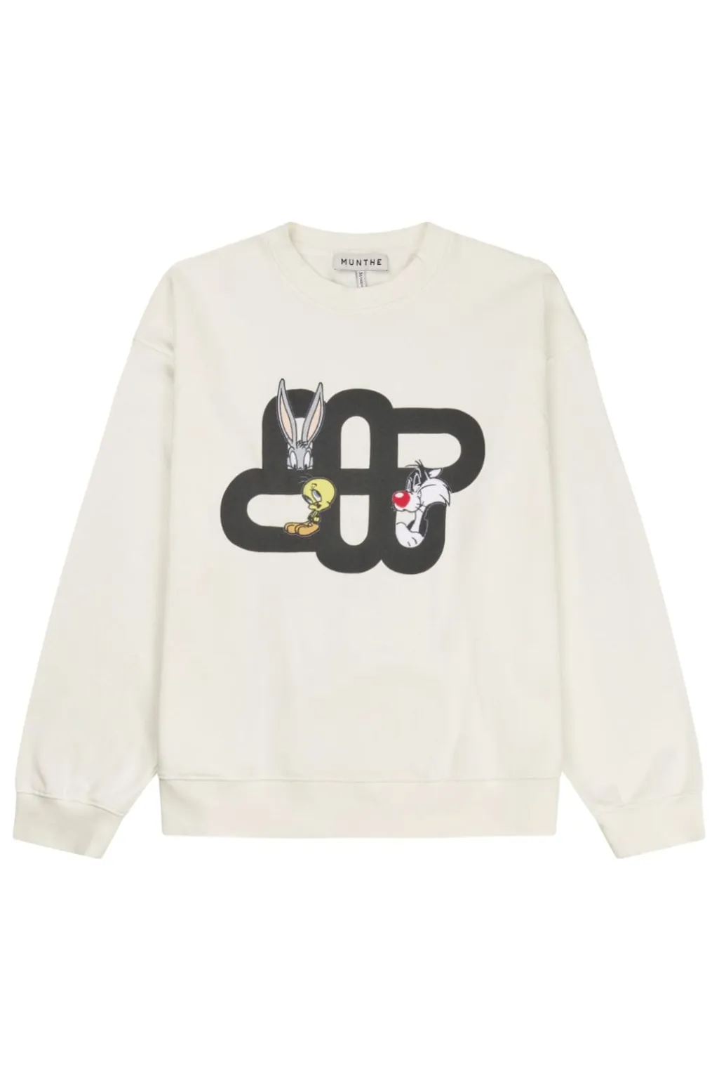 Hvid sweatshirt fra Munthe i samarbejde med Warner Bros. Discovery. Lavet med et grafisk print af Looney Tunes-figurer på forsiden og MUNTHE-logoet i nakken.