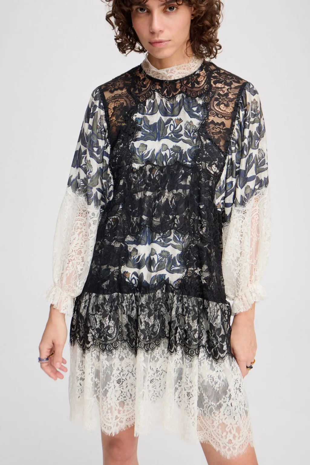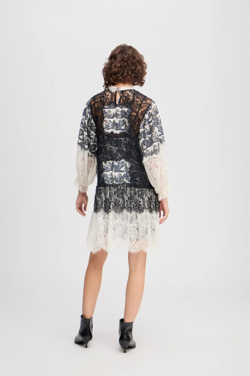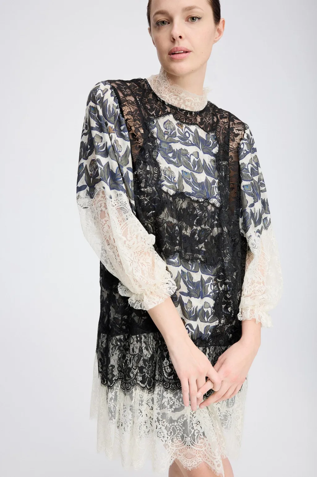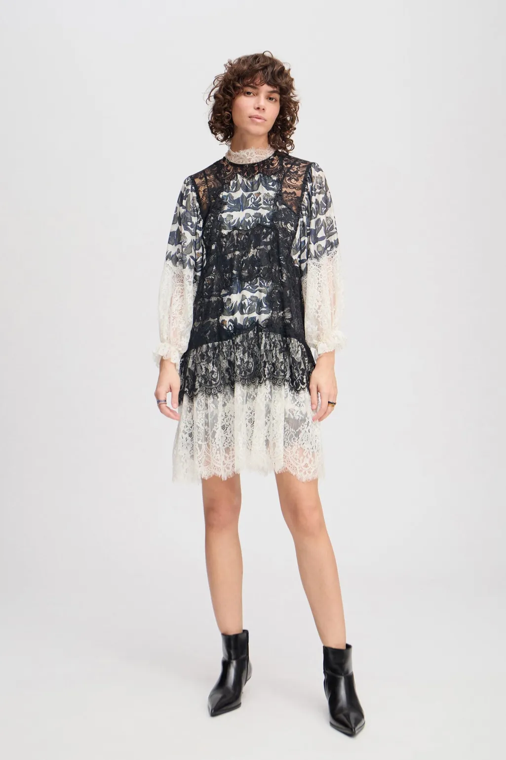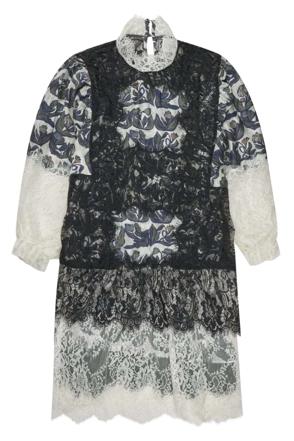 Cremehvid kjole fra Munthe med sort blondeoverdel og blomsterprint. Kjolen har høj hals med blondekant, lange ærmer og løs pasform. Der medfølger en underkjole.