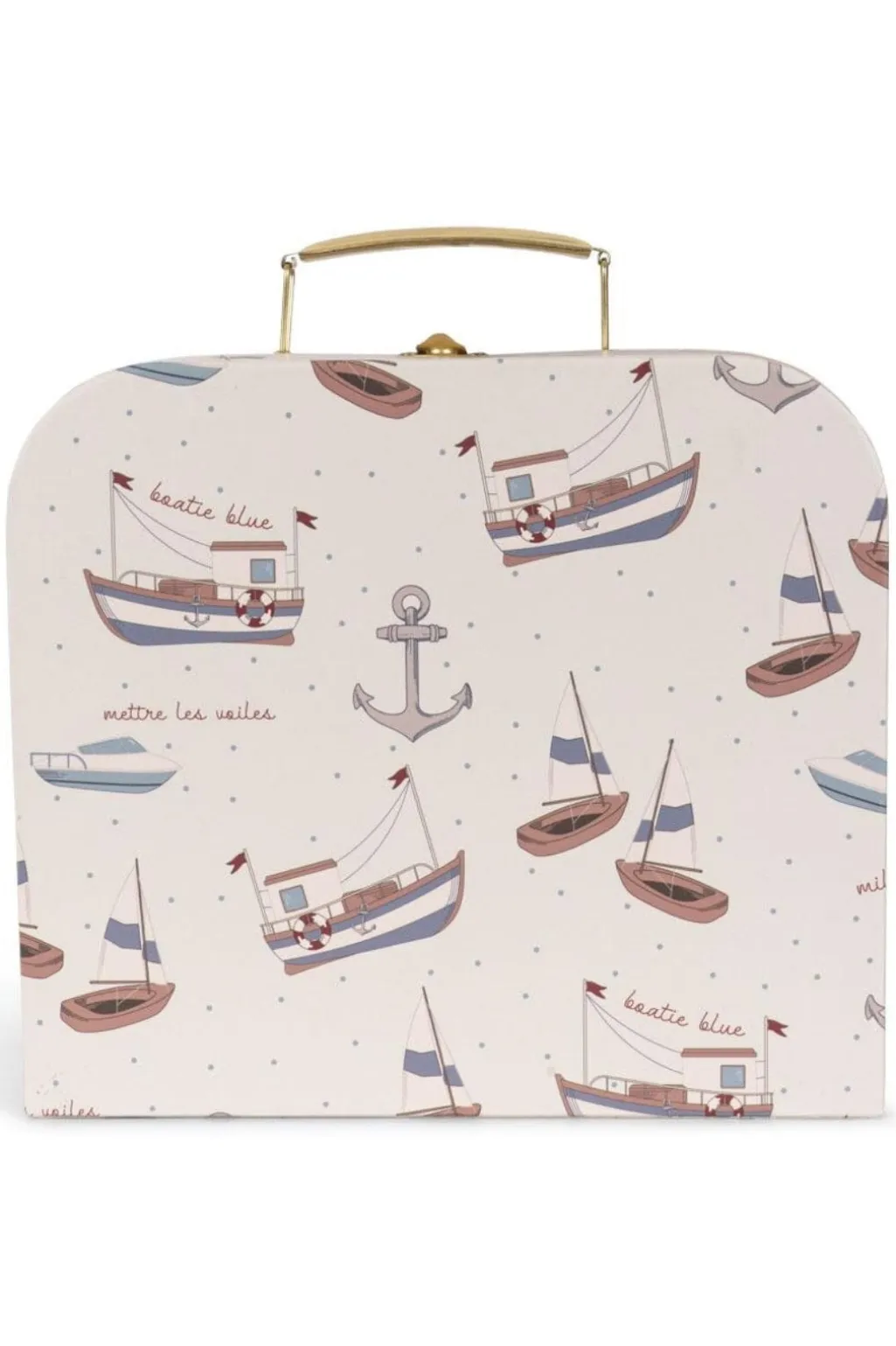 Et kreativt sæt fra Konges Sløjd med maritime motiver. Det indeholder notesbøger og farverige tuscher i en taske med båd- og ankermønster i lyseblå og cremefarvede nuancer.
