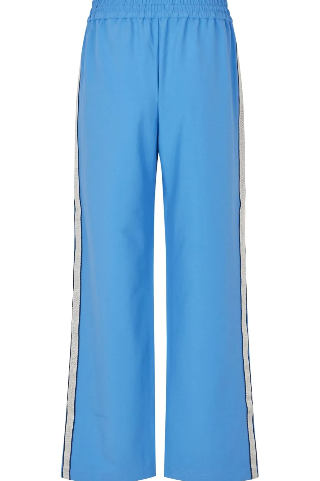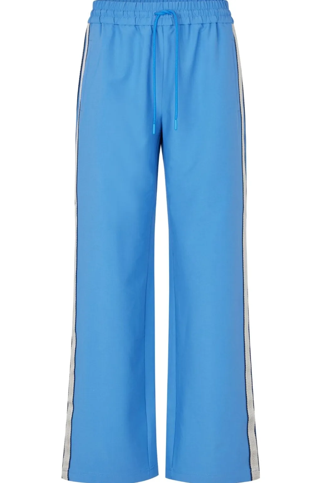 Blå bukser fra MbyM med vide ben og ankellængde. Bukserne har striber langs siden og en elastisk talje med snørelukning.