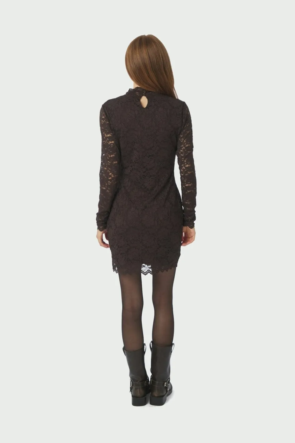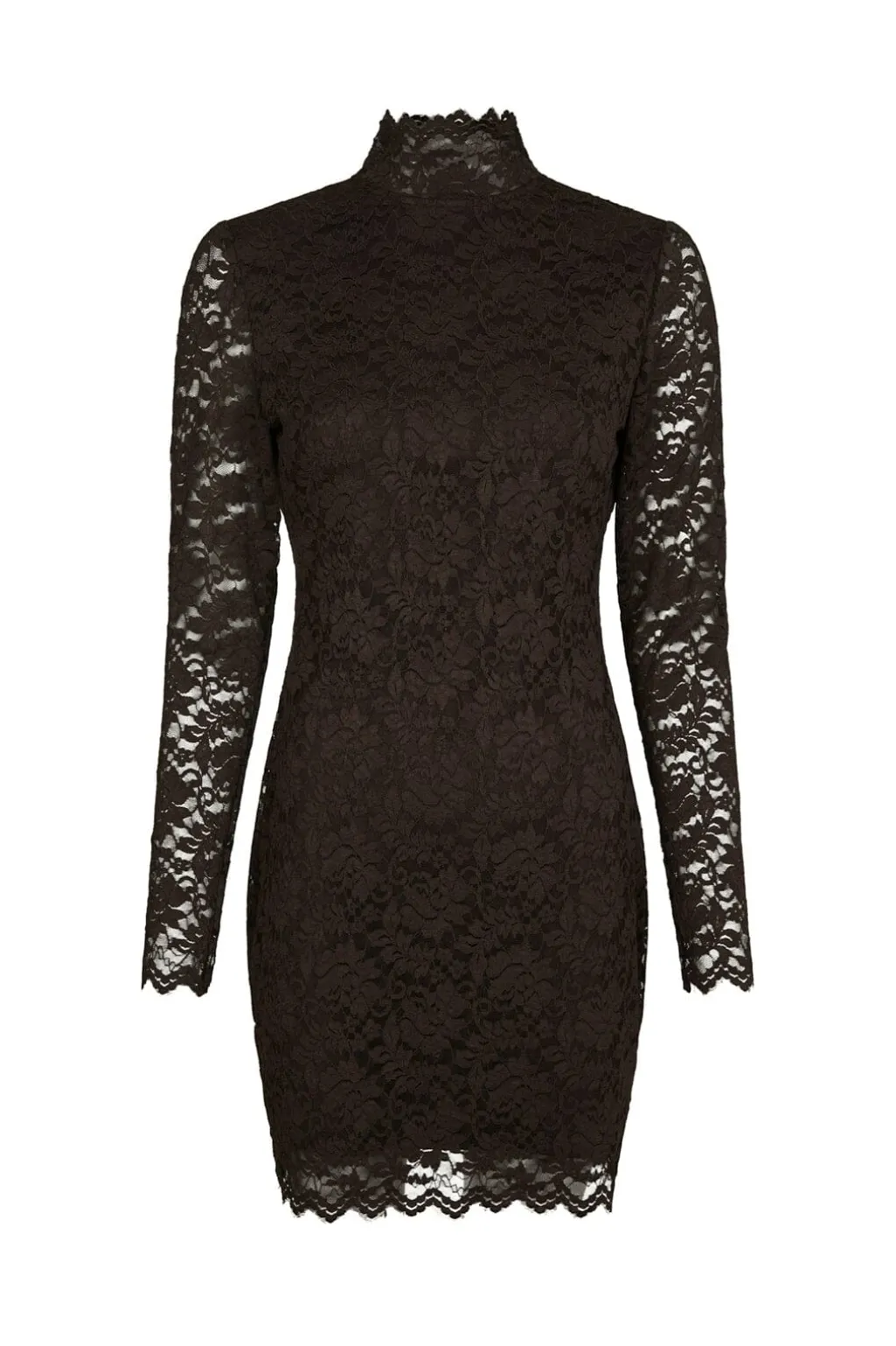 Brun blondekjole fra Neo Noir med høj hals og lange ærmer. Kjolen har et gennemgående blomstermønster i blonde og en knaplukning på ryggen.