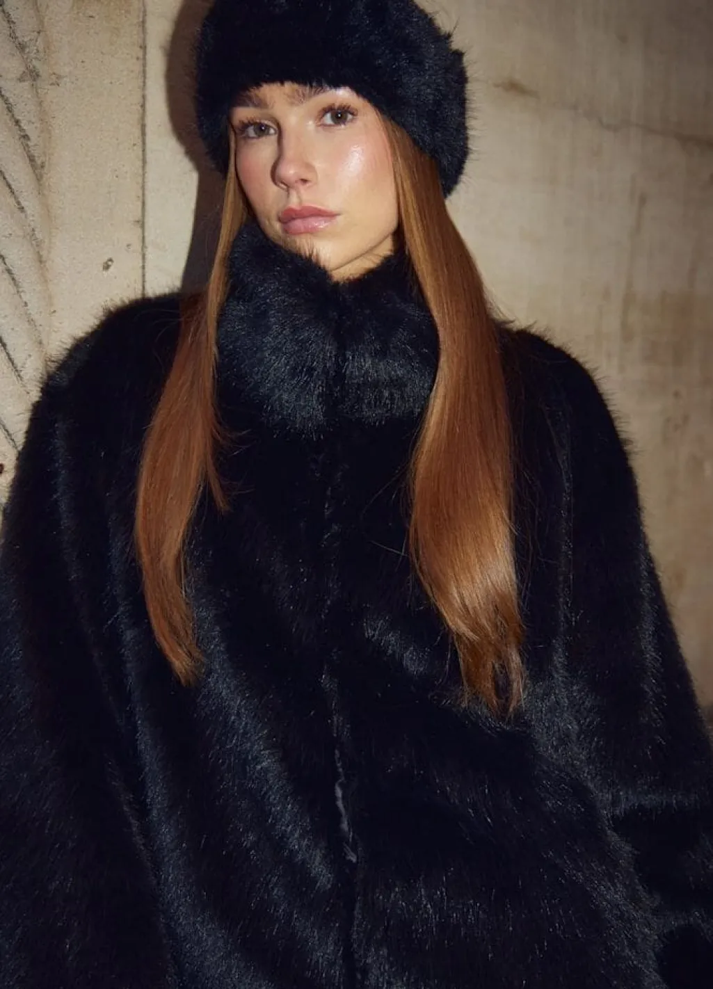Sort jakke fra Noella, lavet af faux fur-materiale med en skinnende overflade. Jakken har en oversized pasform og en høj krave.