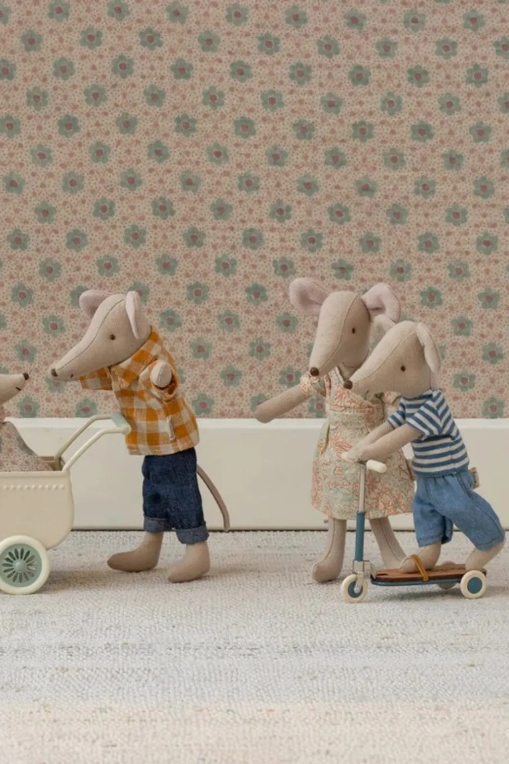 Blåt løbehjul fra Maileg med træplade og hvide hjul. Løbehjulet er designet til leg med Maileg-mus og har praktiske detaljer, der holder musen sikkert på plads under legen.
