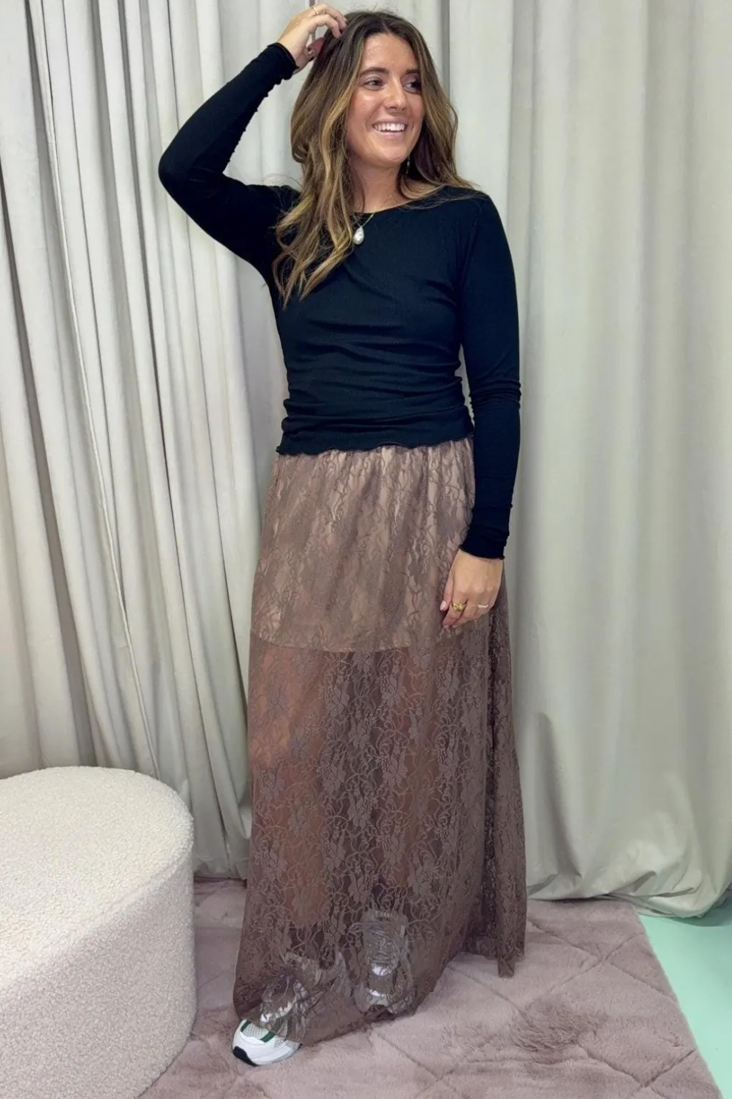 Lang blondenederdel fra A-bee i taupe. Den har et blomstermønster i blonden og en ankellængde, der gør den velegnet til festlige lejligheder.