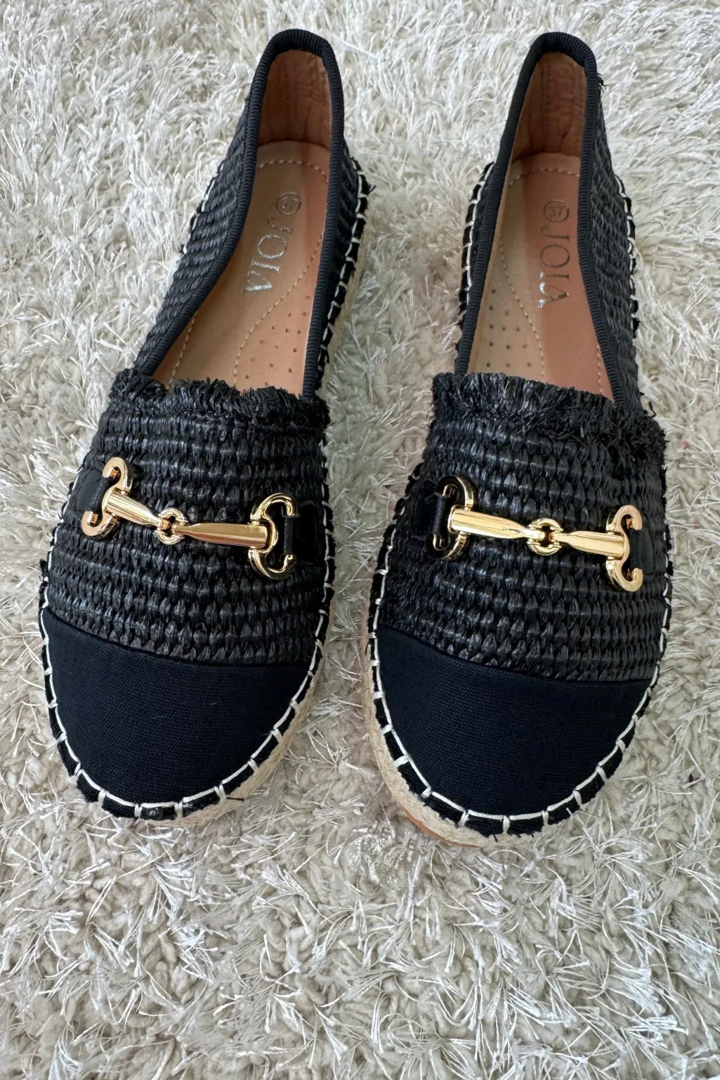 Sort espadrille fra Bloom med vævet overdel og guldfarvet spænde. Skoen har en flad sål med hvide syninger langs kanten og en rund tå.