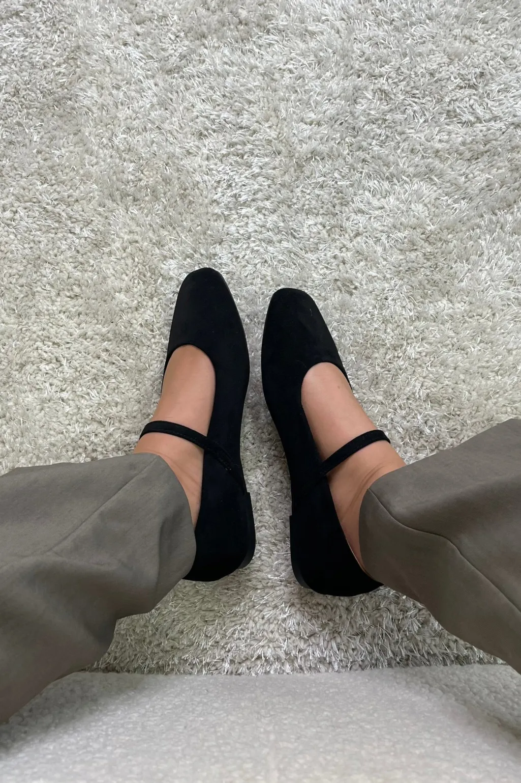 Sorte ballerinaer fra Bloom med mandelformet tå og rem over vristen. Skoene er fremstillet i syntetisk materiale med en lav hæl og spændelukning.