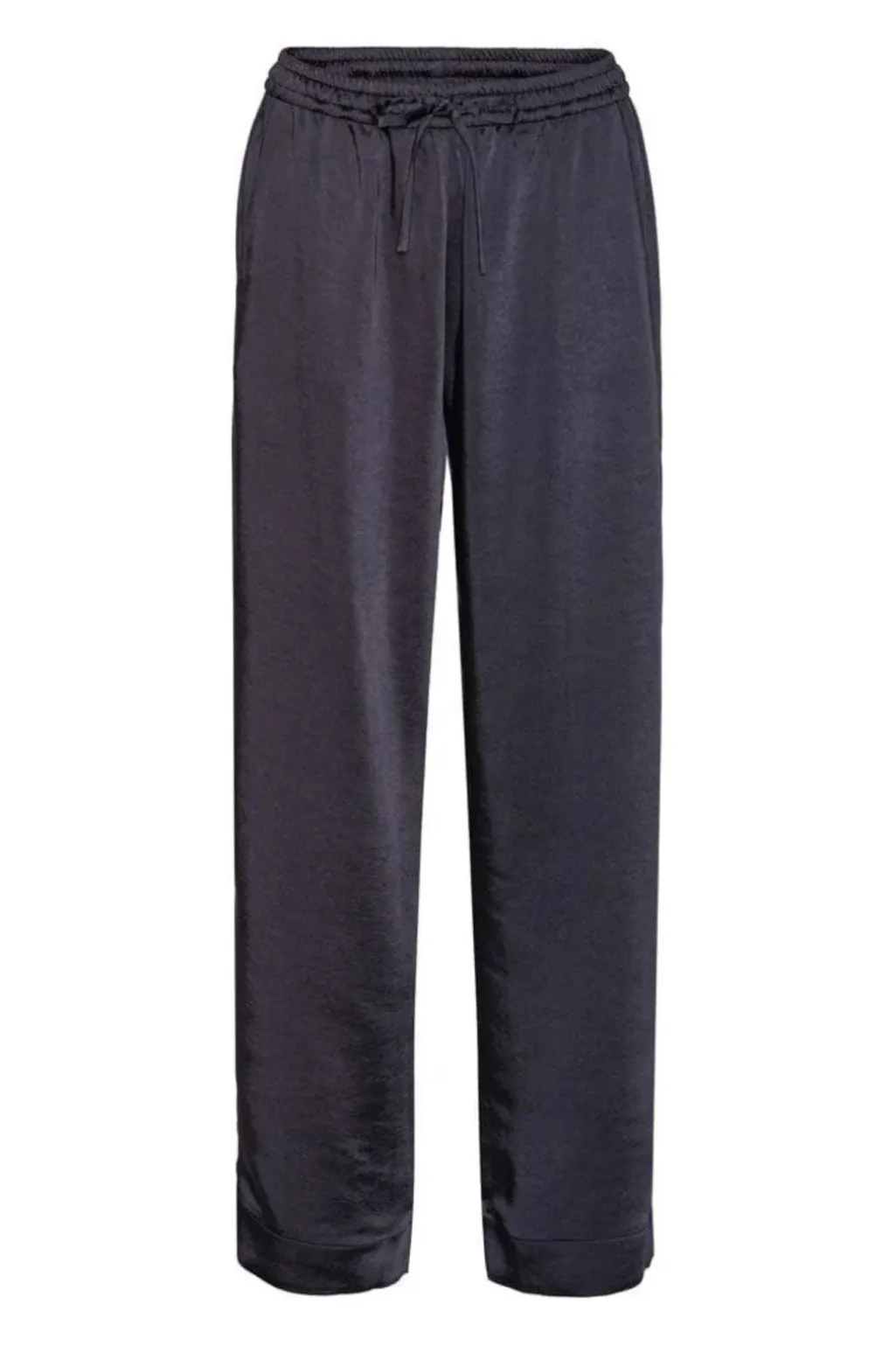 Mørkeblå bukser fra Karmamia med et glat stof og let glans. Bukserne har en afslappet pasform med elastisk talje, bindebånd og praktiske sidelommer.