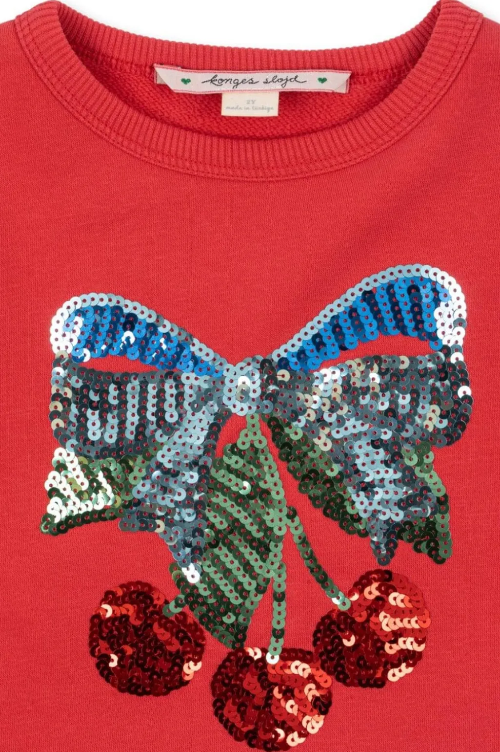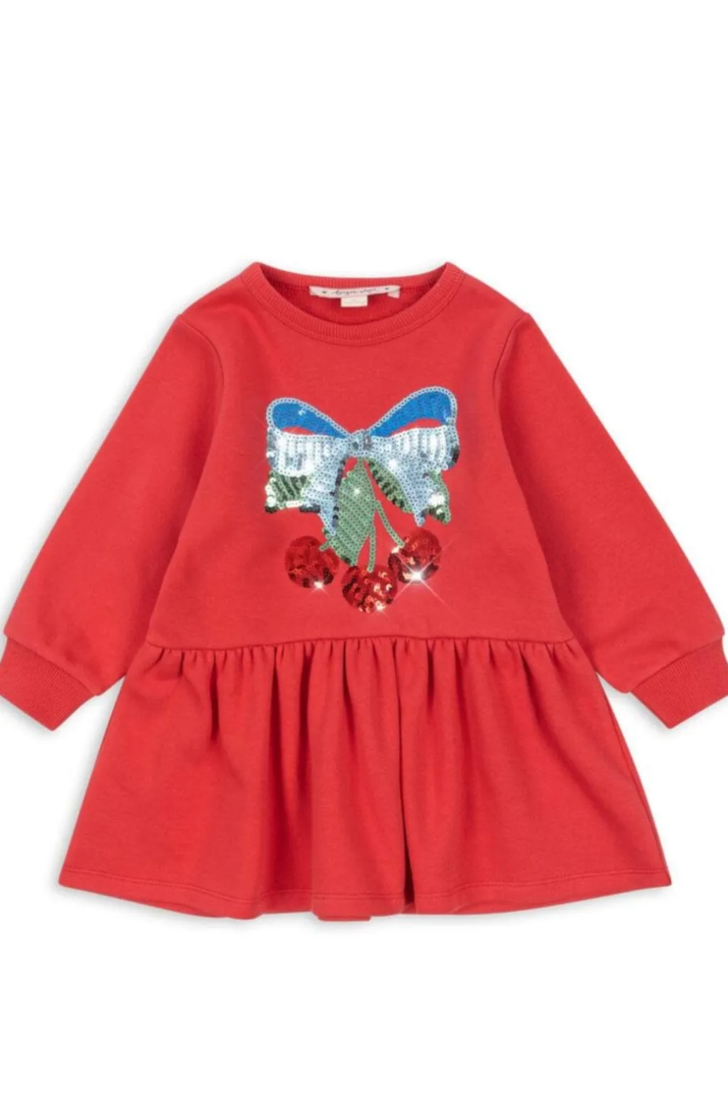 Sweatkjole fra Konges Sløjd i rød farve. Kjolen har pailletdekoration foran og kombinerer både ensfarvet og printet design.