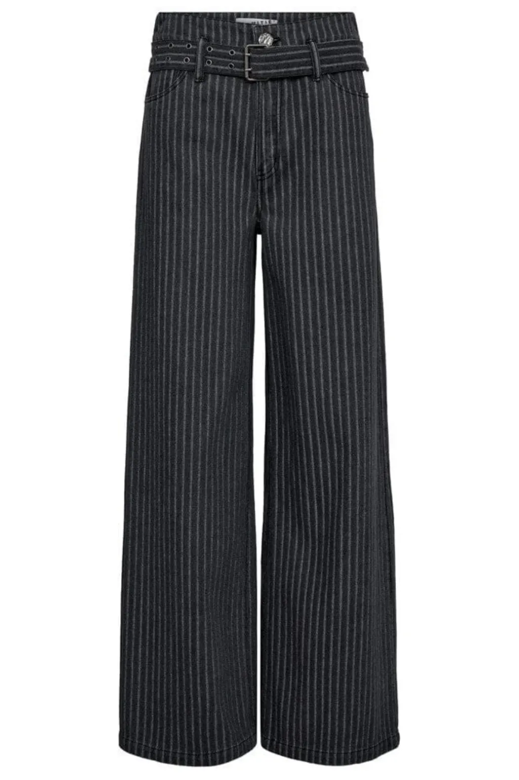 Mørkegrå jeans fra Haute L’Amitié med vertikale striber. Jeansene har brede ben, høj talje og en gulvlang længde.