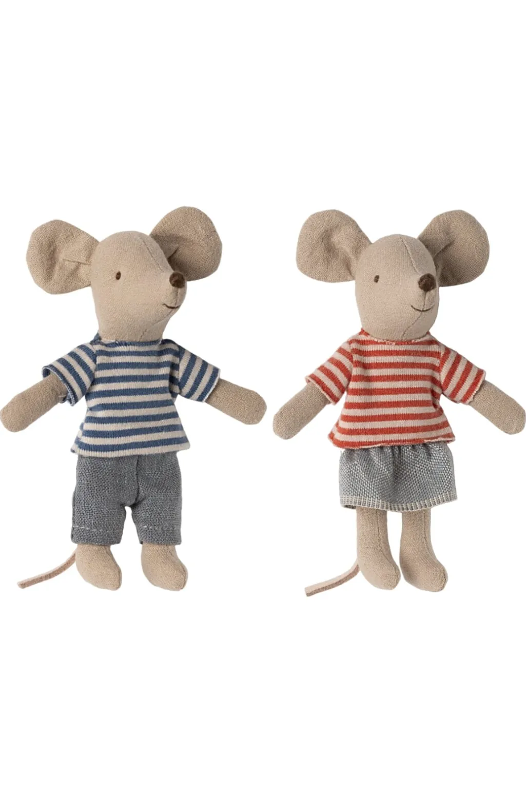 To mus fra Maileg, klædt i stribede trøjer og shorts. Den ene har en blåstribet trøje, den anden en rødstribet.
