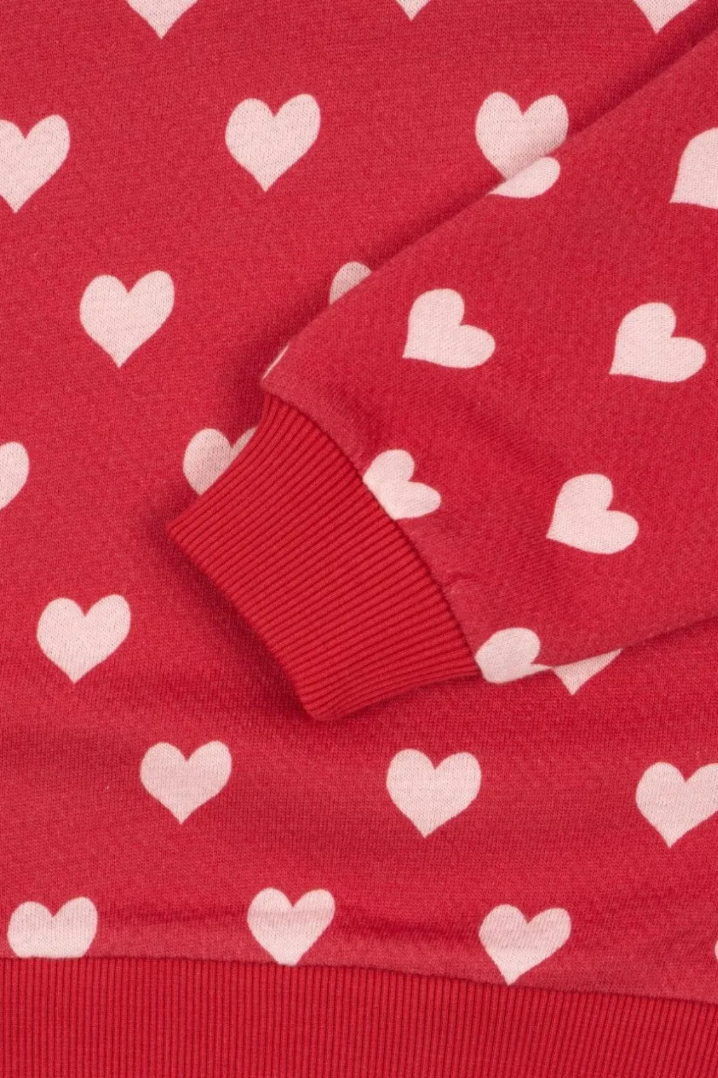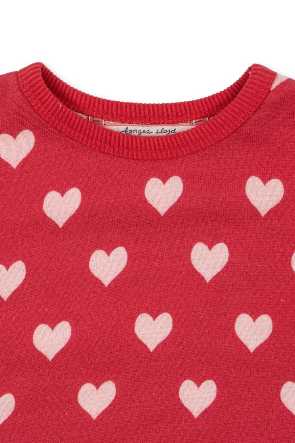 Rød sweatshirt fra Konges Sløjd med hvidt hjertemønster. Trøjen har lange ærmer, rund hals og ribstrikkede kanter ved halsen, ærmerne og nederst.