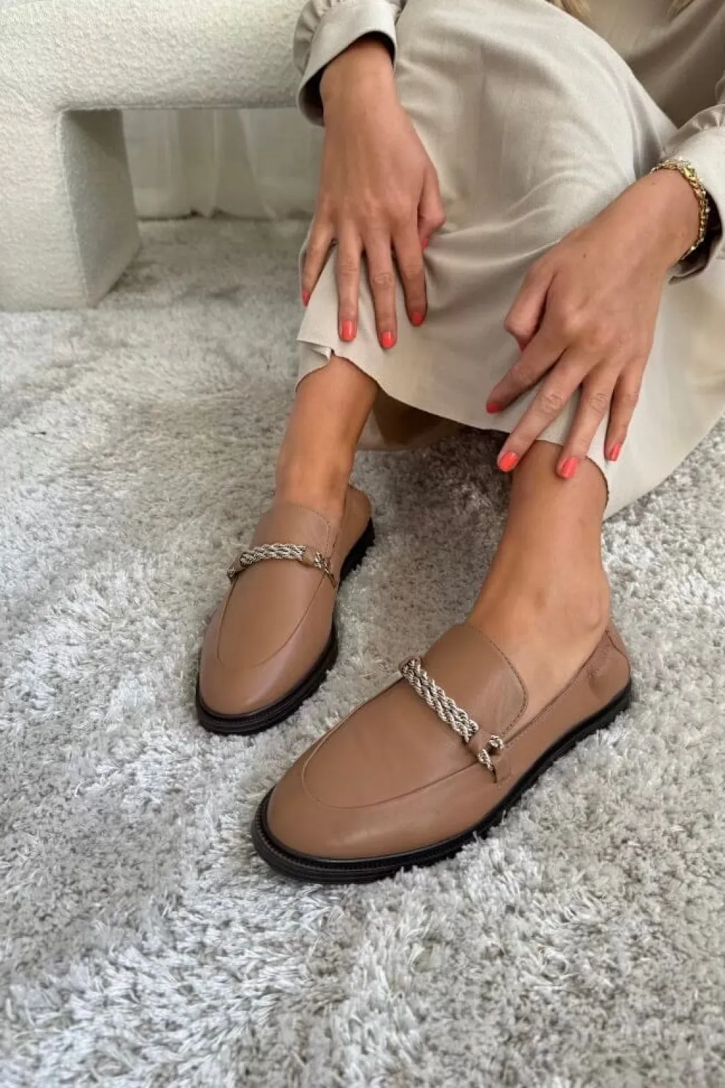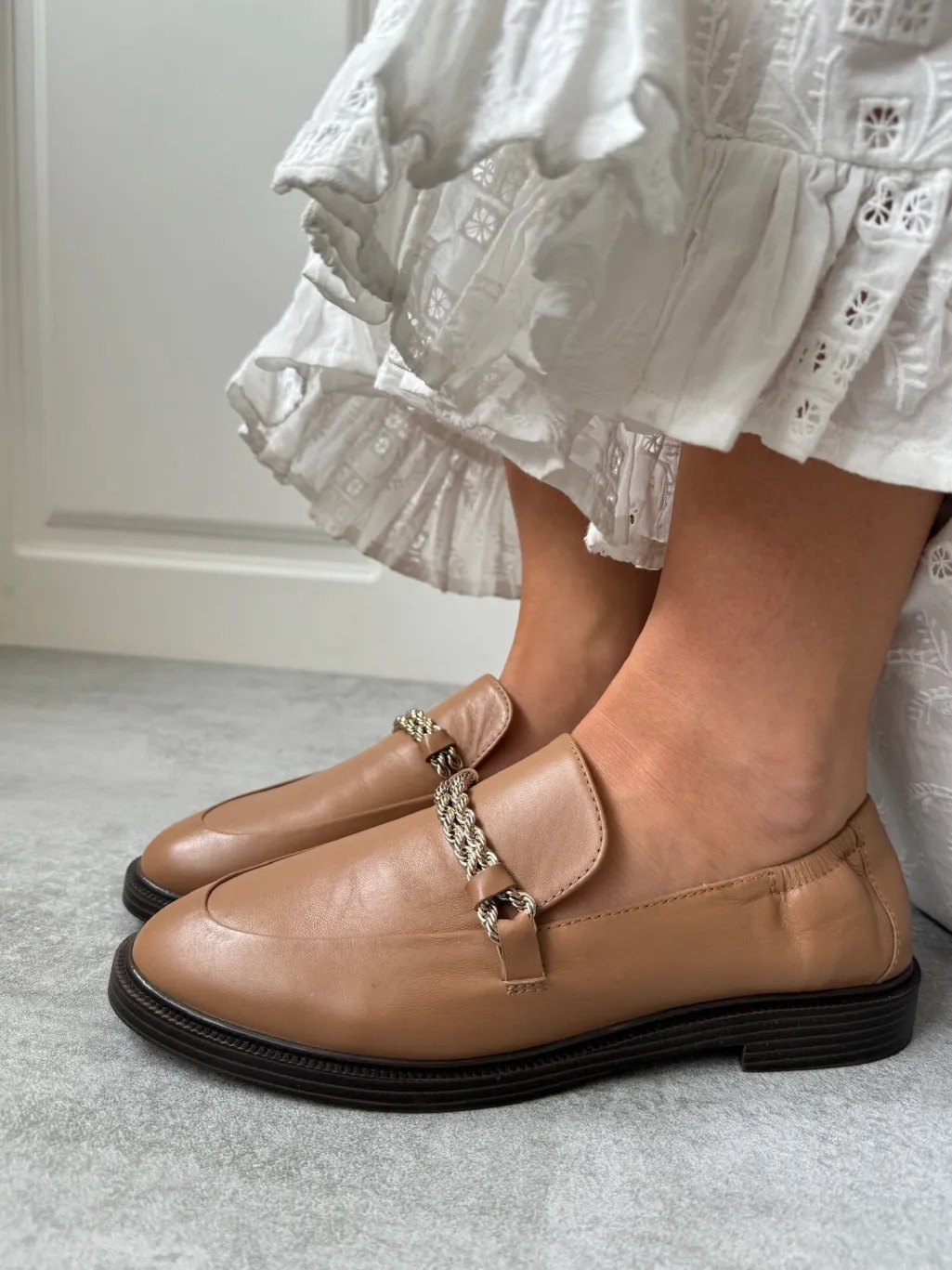 Loafers fra Copenhagen Shoes i blødt læder med cappuccinofarve. Skoen har en specialdesignet latexskum-indersål og dekorative syninger med kædedetalje i guldmetal.