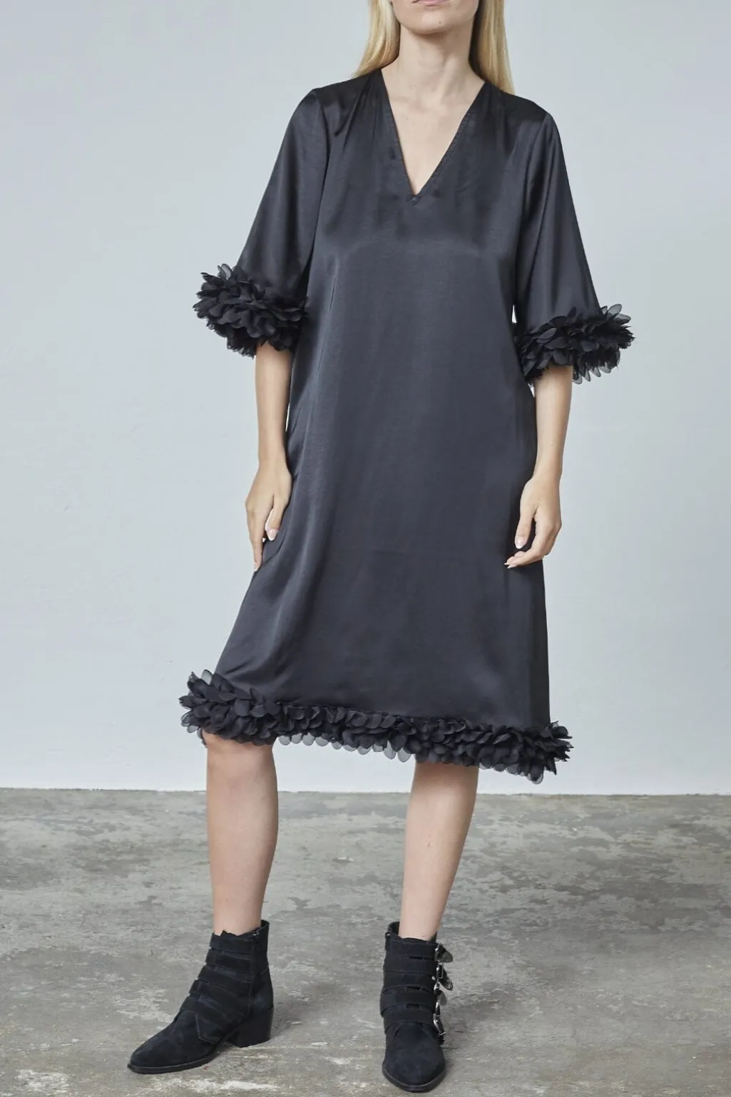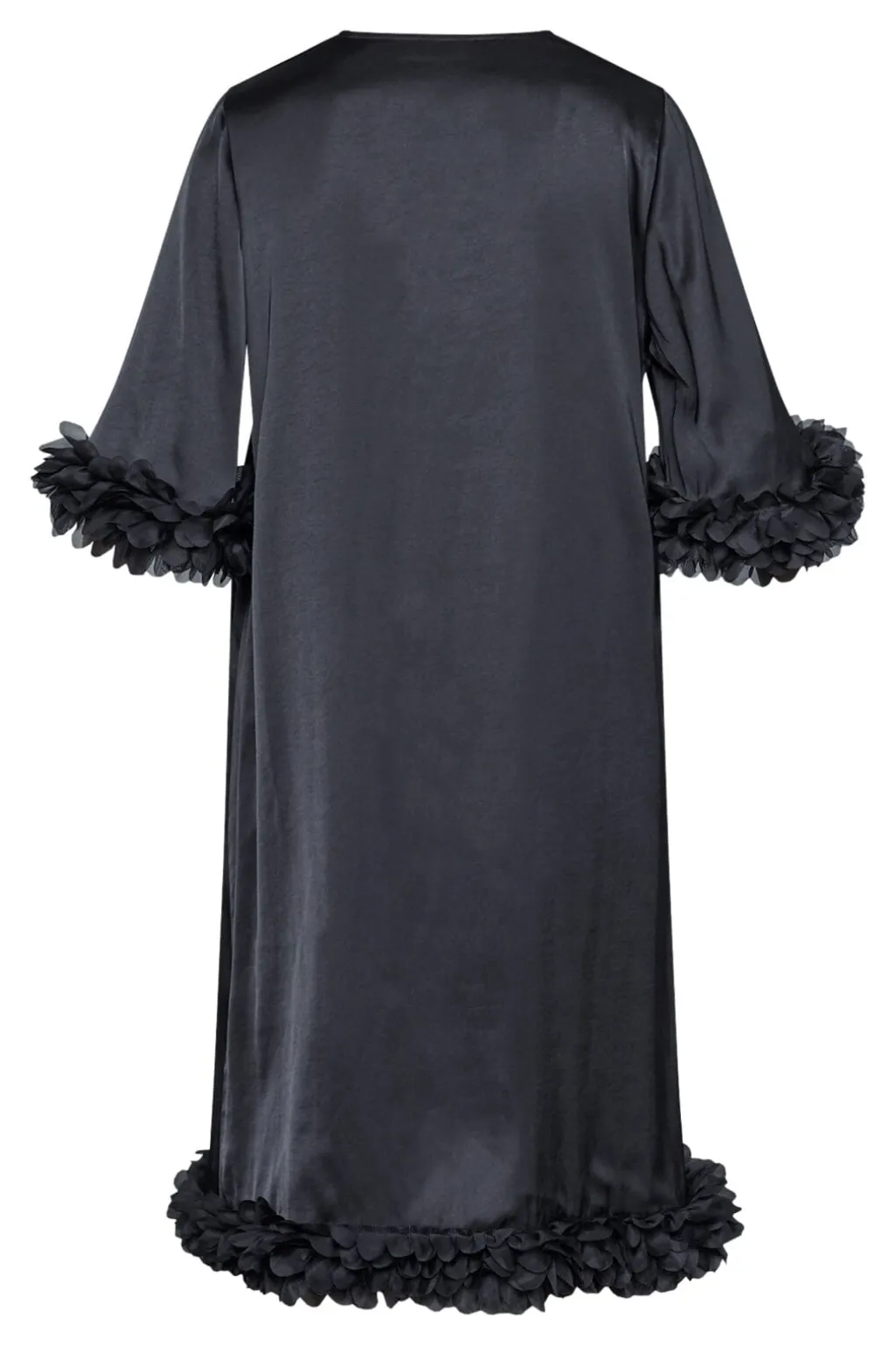 Sort kjole fra Love & Divine med flæsedetaljer ved ærmerne og kanten. Kjolen har en V-udskæring og 3/4-ærmer.