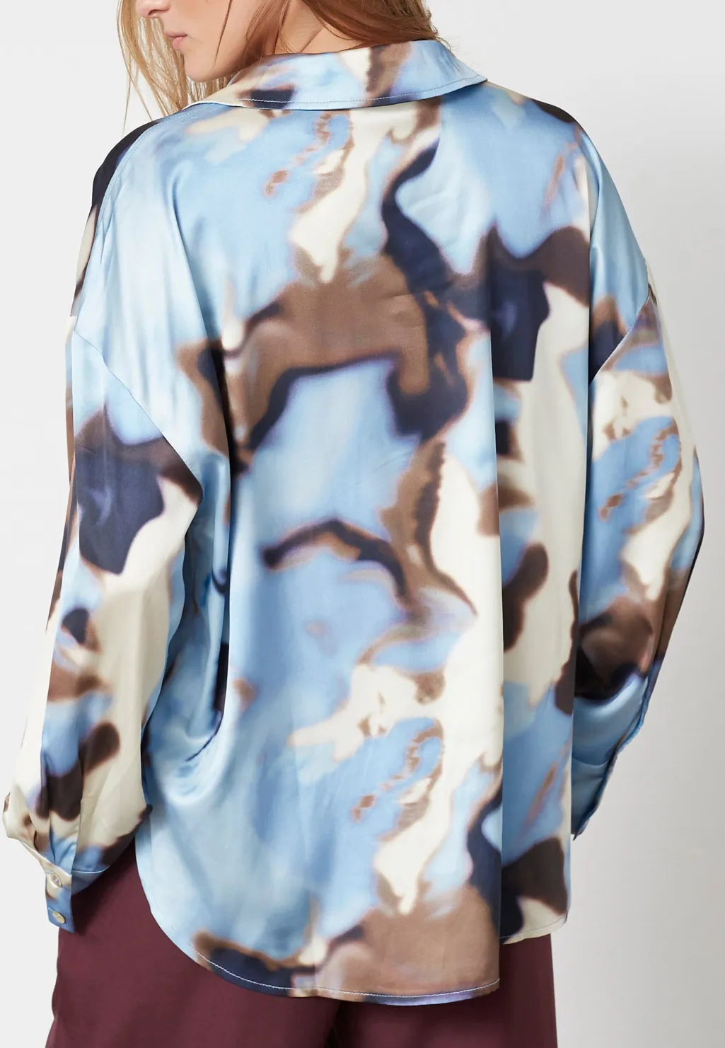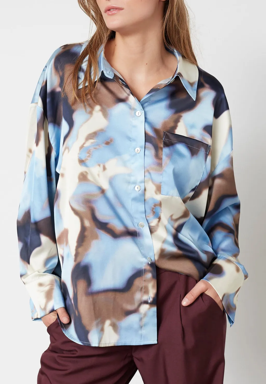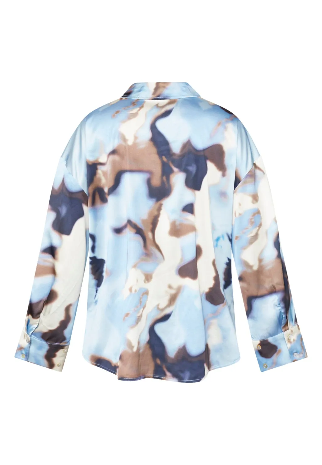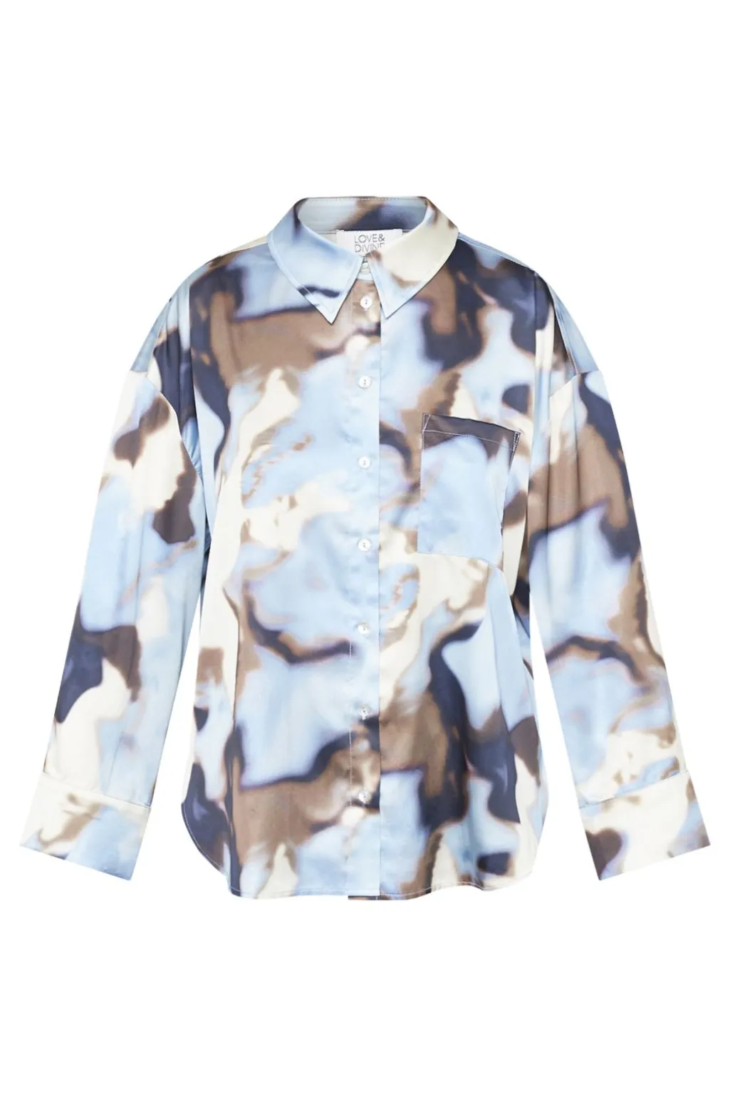 Skjorte fra Love & Divine med et abstrakt mønster i lyseblå og brune nuancer. Lavet af 100 % polyester med klassisk krave og knaplukning.