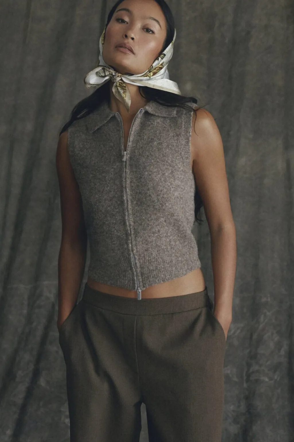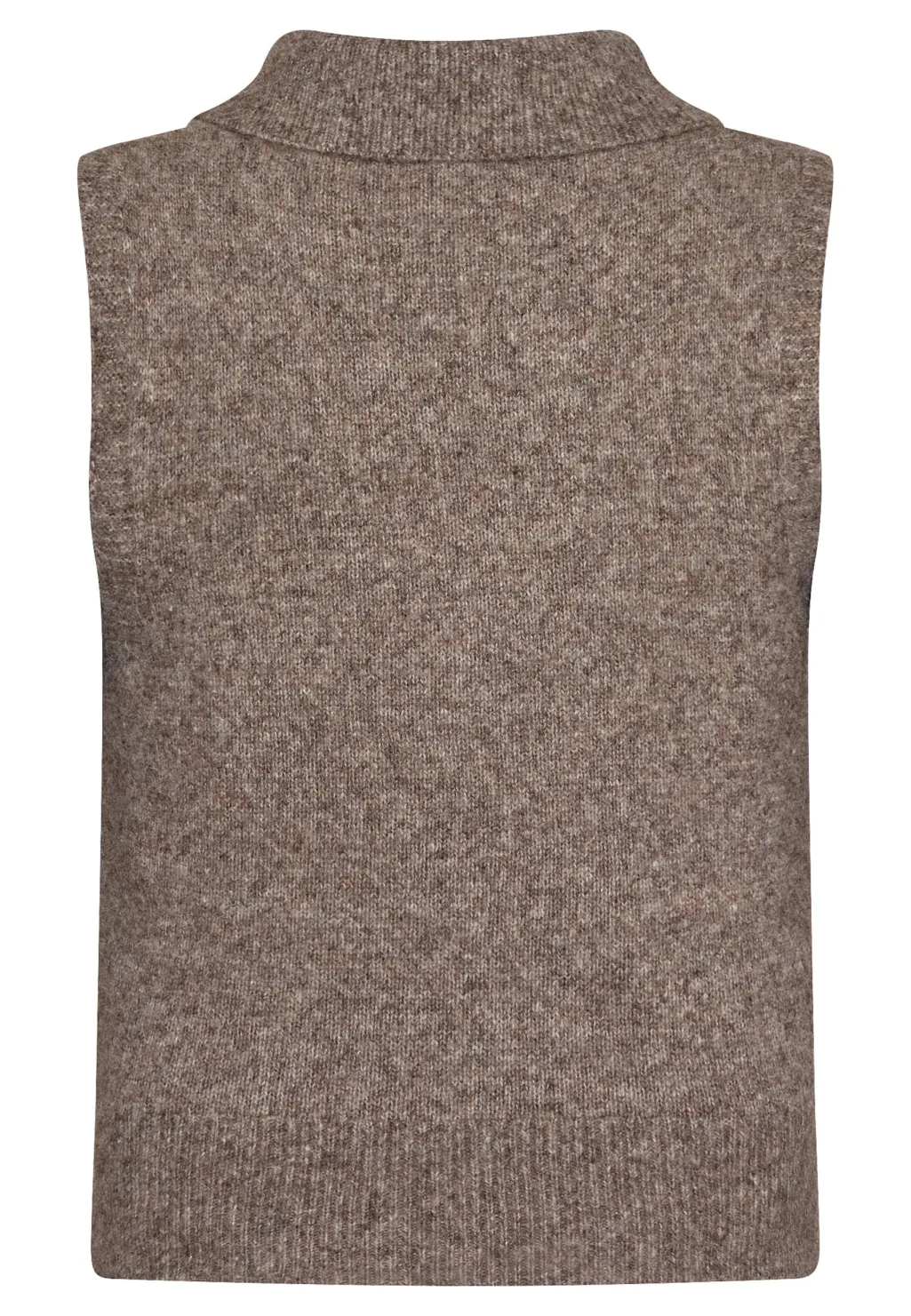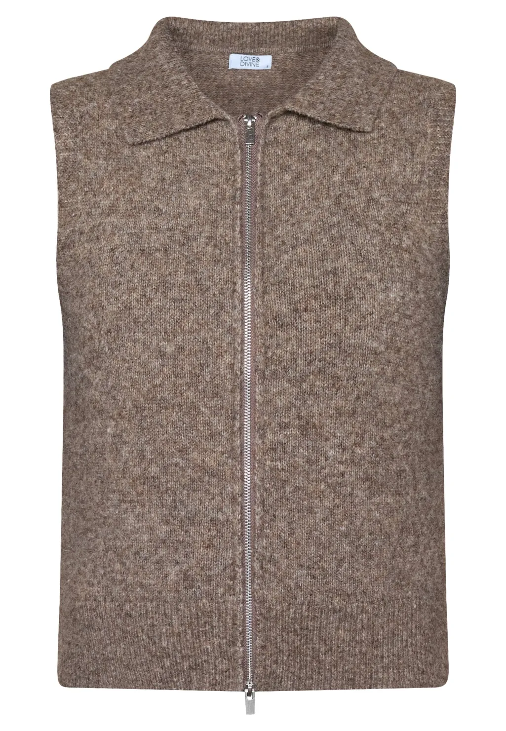 Ærmeløs strikvest fra Love & Divine i brun meleret farve. Vesten har en polokrave og fuldlængde lynlås i front.