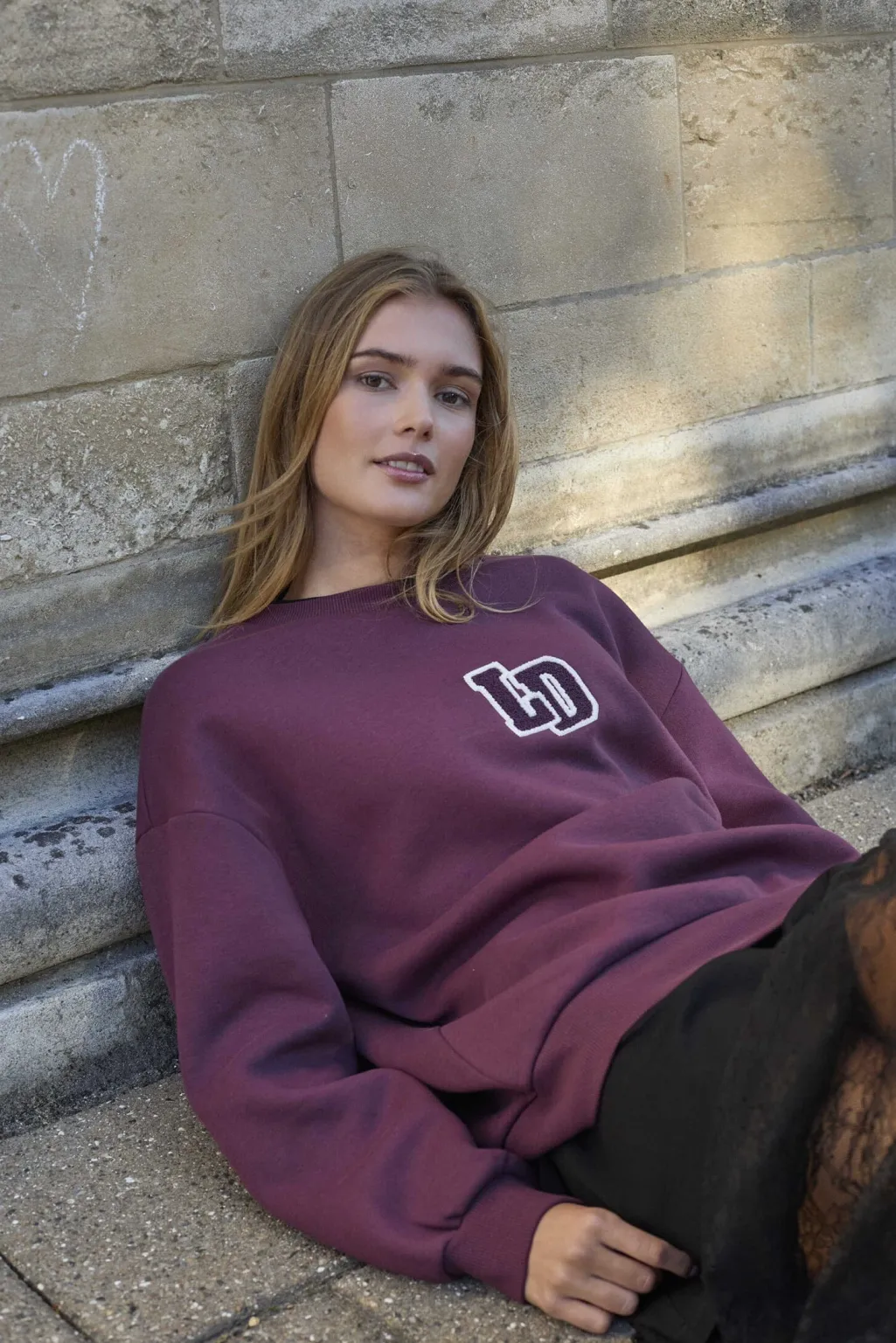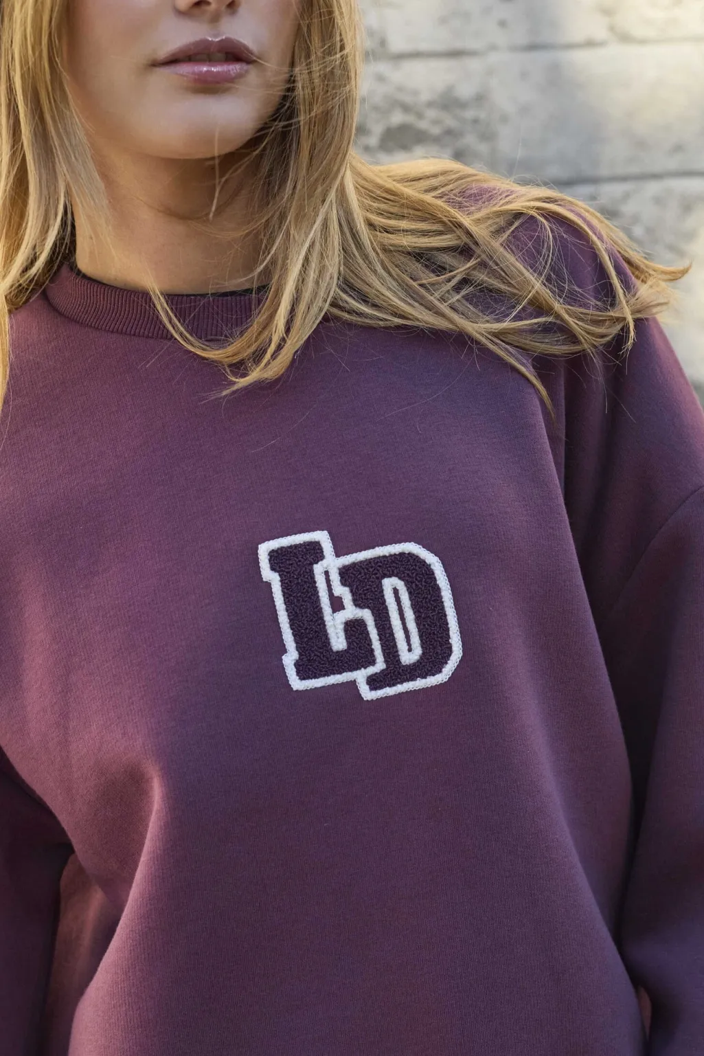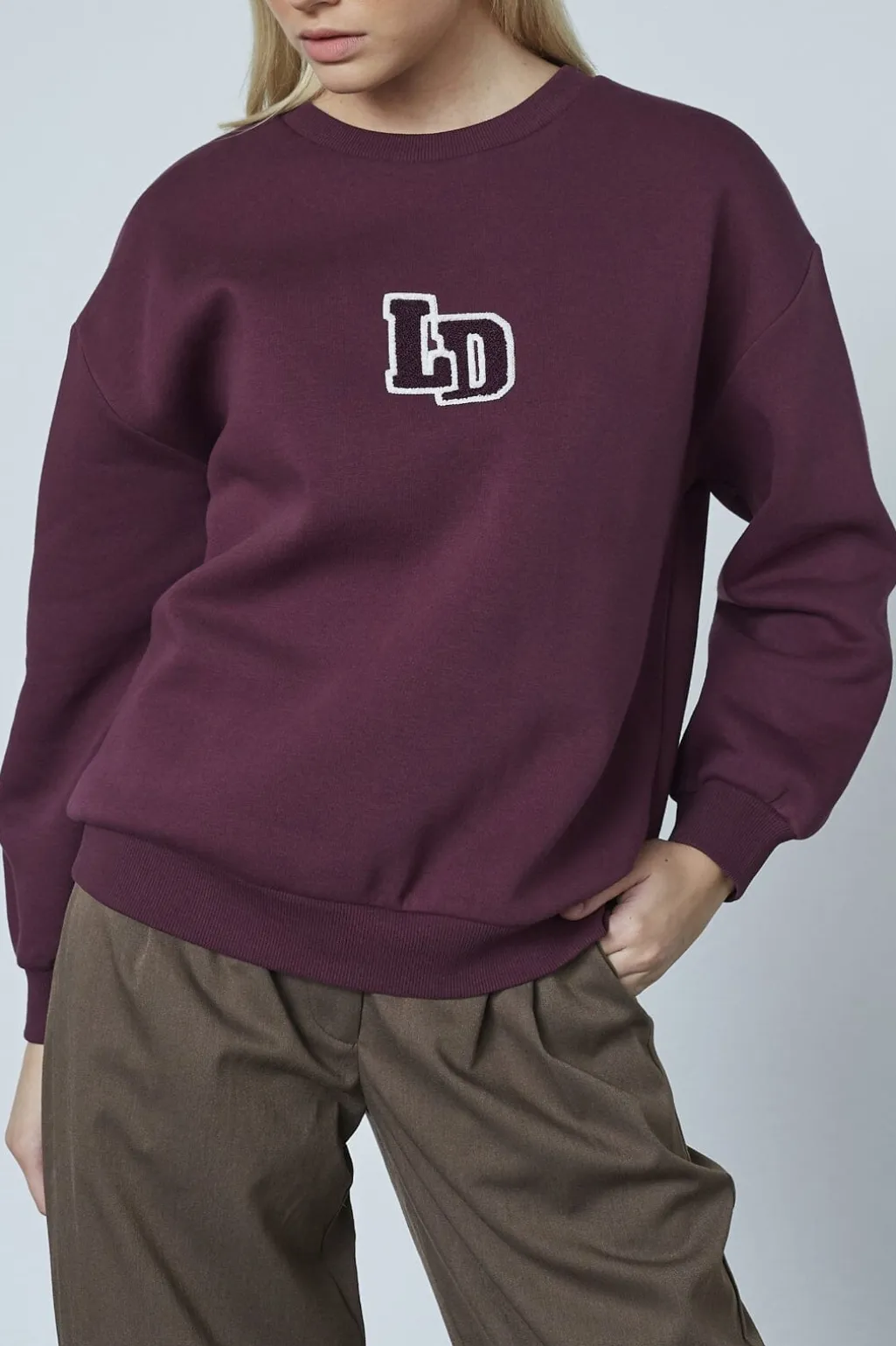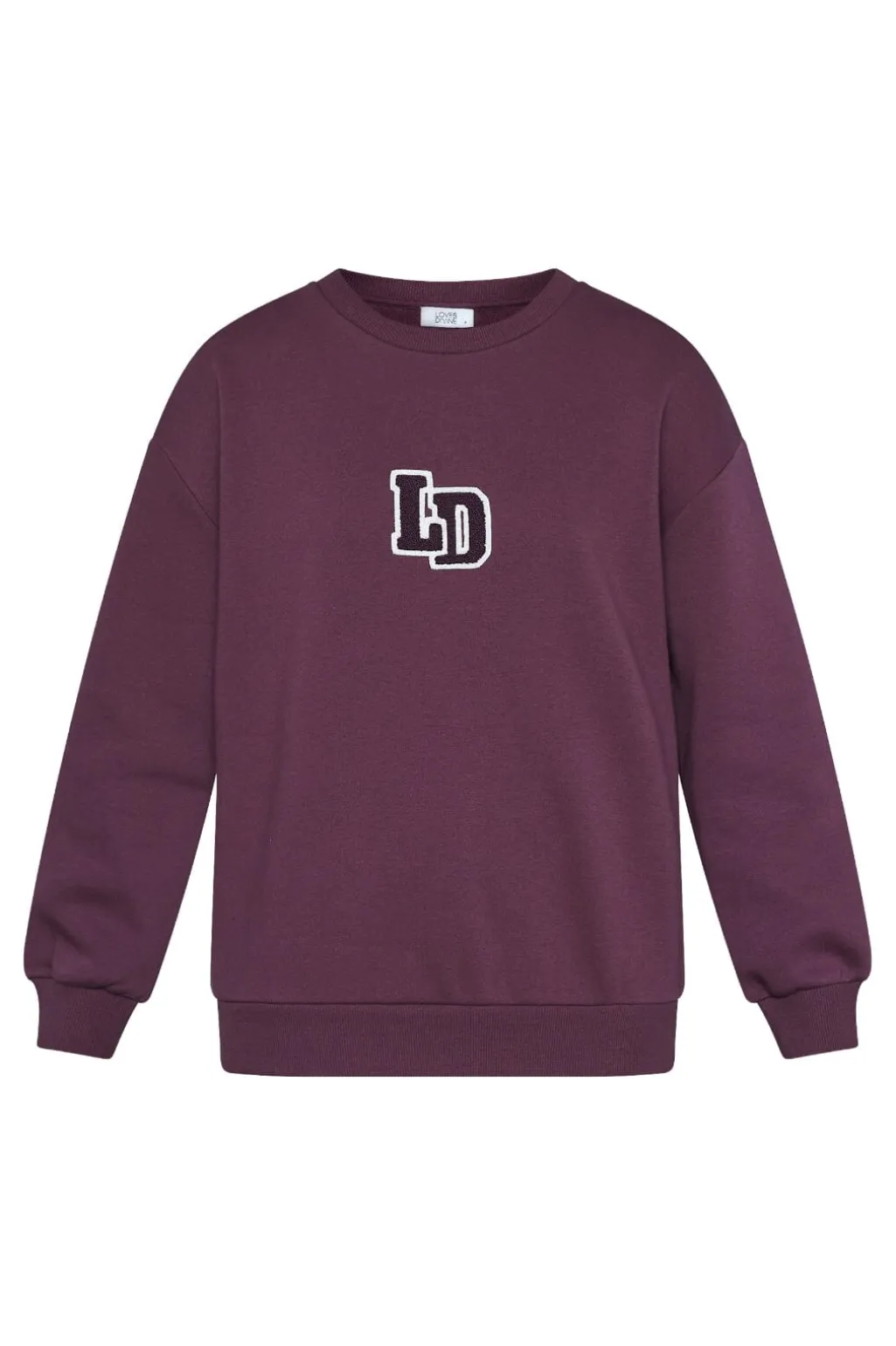 En sweatshirt fra Love & Divine i en dyb bordeauxfarve. Sweatshirten har dekorative syninger og broderi på fronten med et LD-logo.