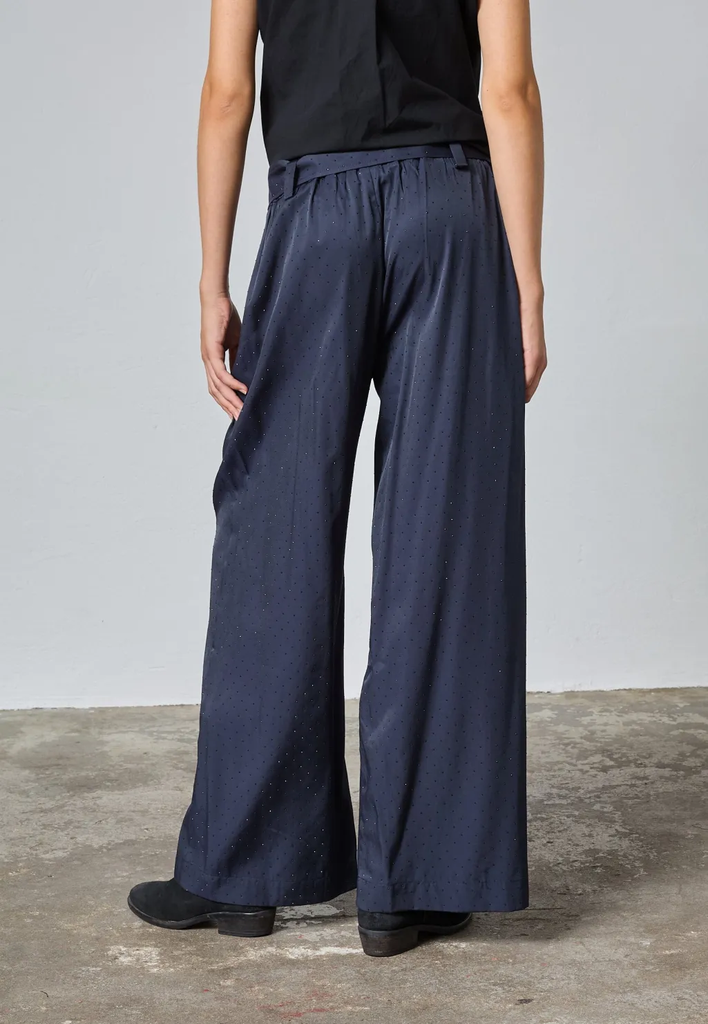 Mørkeblå bukser fra Love & Divine med små prikker og pailletter. Bukserne har høj talje, løs pasform og går til anklen.