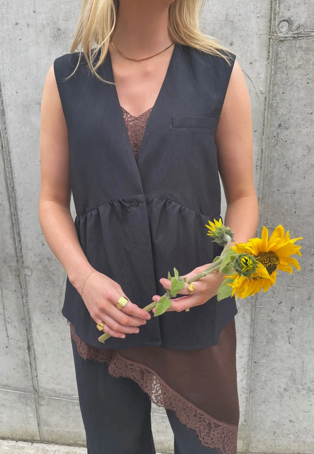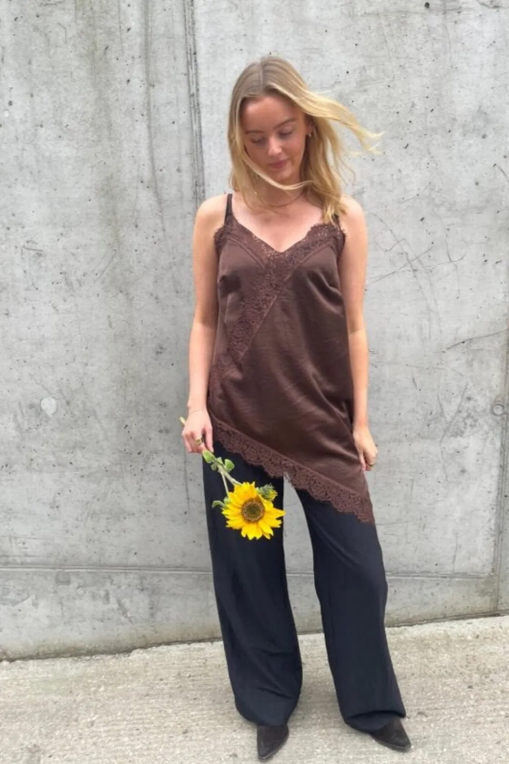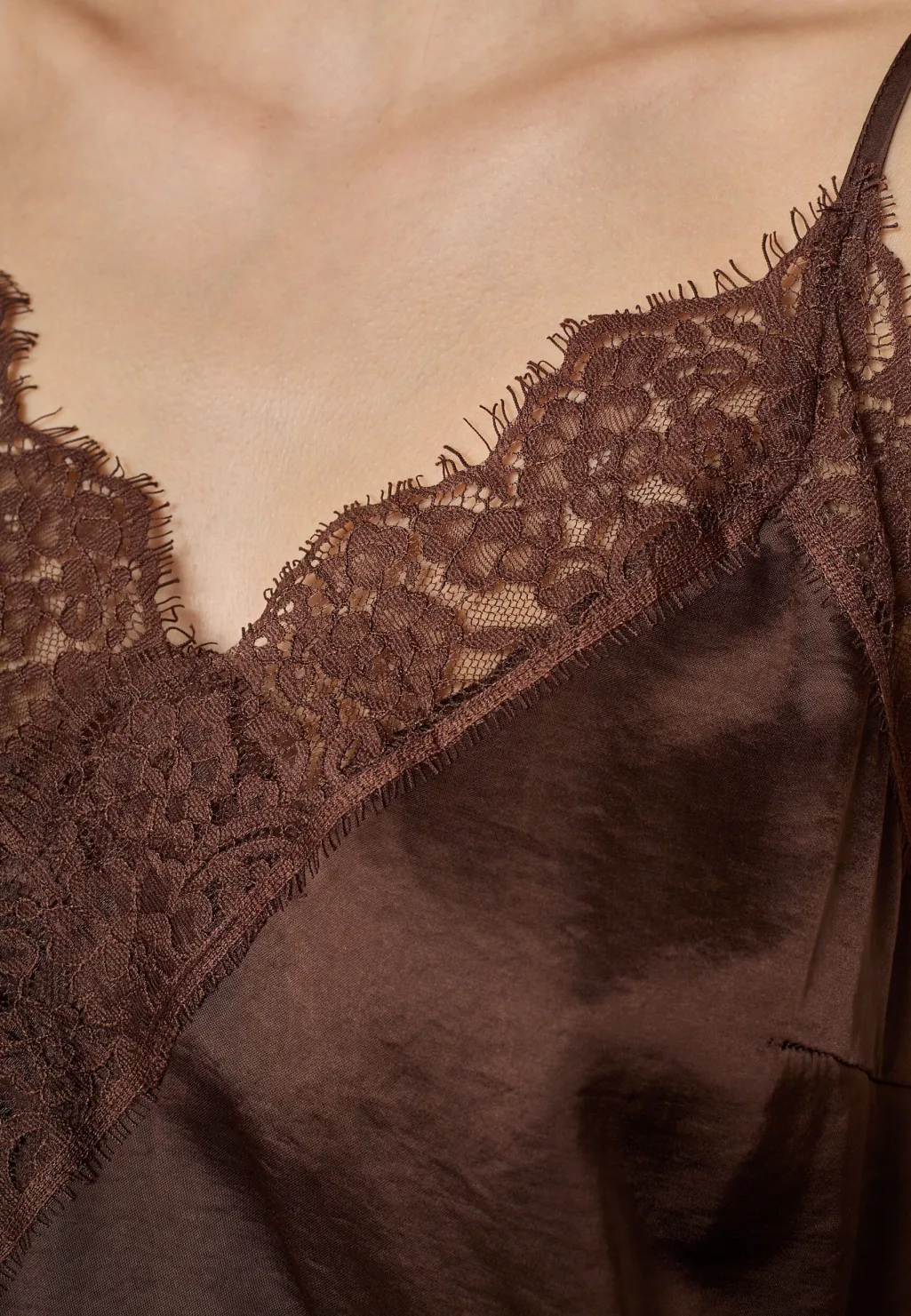 Brun satin top fra Love & Divine med blonder-detaljer. Toppen har en asymmetrisk kant med blonde i bunden og tynde spaghetti-stropper med V-hals.