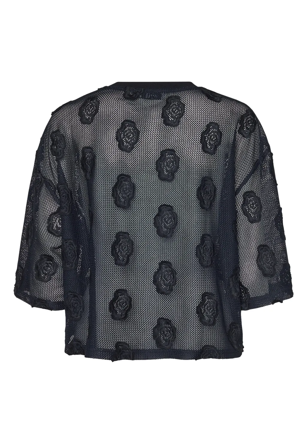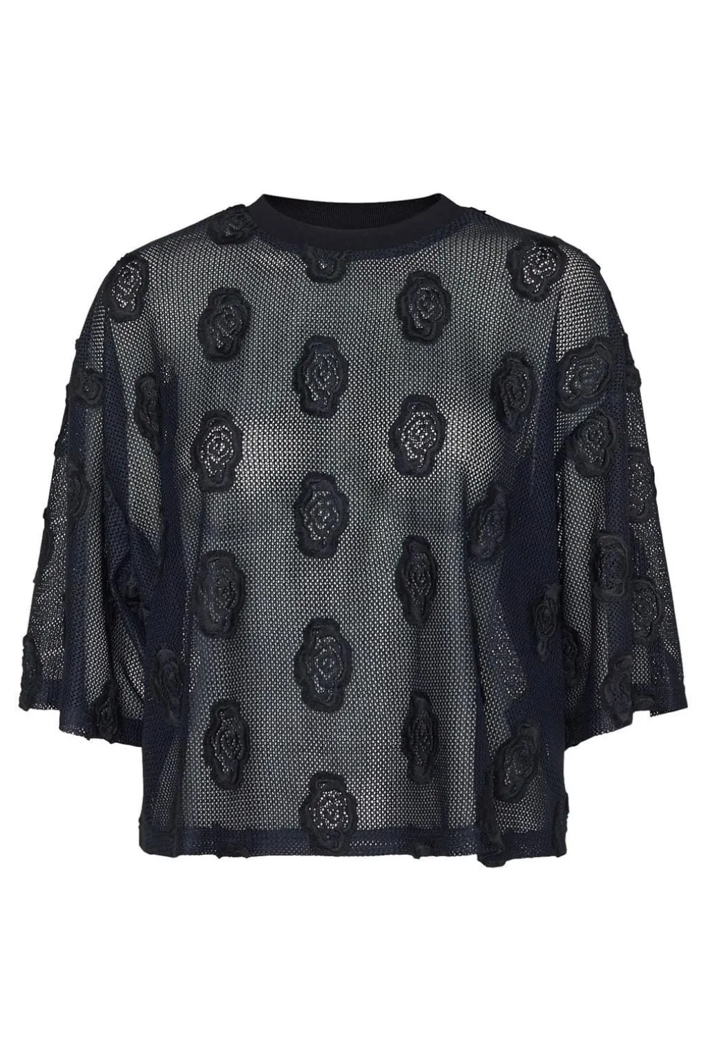 Sort bluse fra Love & Divine, lavet af mesh med blomsterlignende applikationer. Blusen har korte, løse ærmer og en rund halsudskæring.