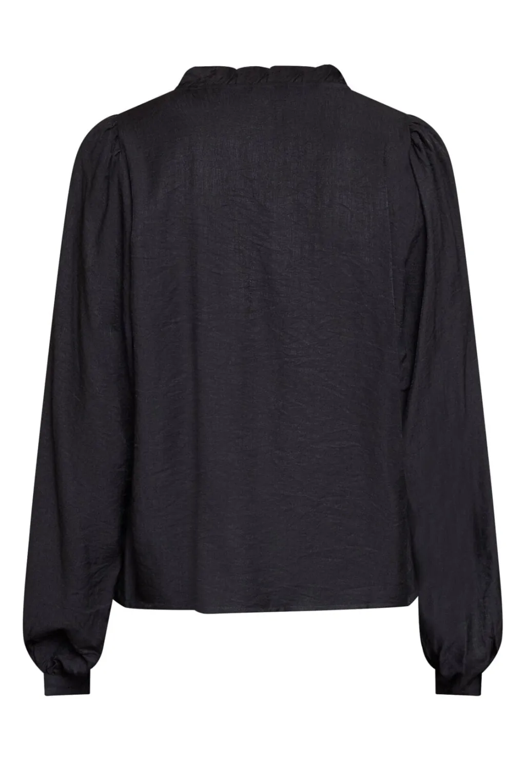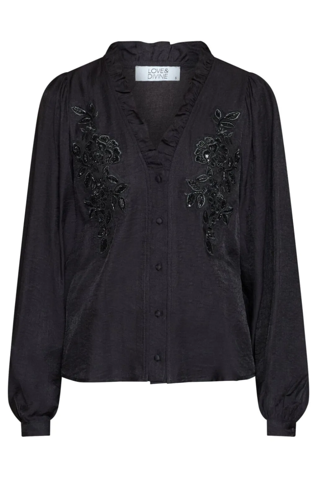 Sort skjorte fra Love & Divine med blomstret broderi, pailletter og flæser på forsiden. Den har en rynket krave ved V-halsen og lange ærmer med manchetter.