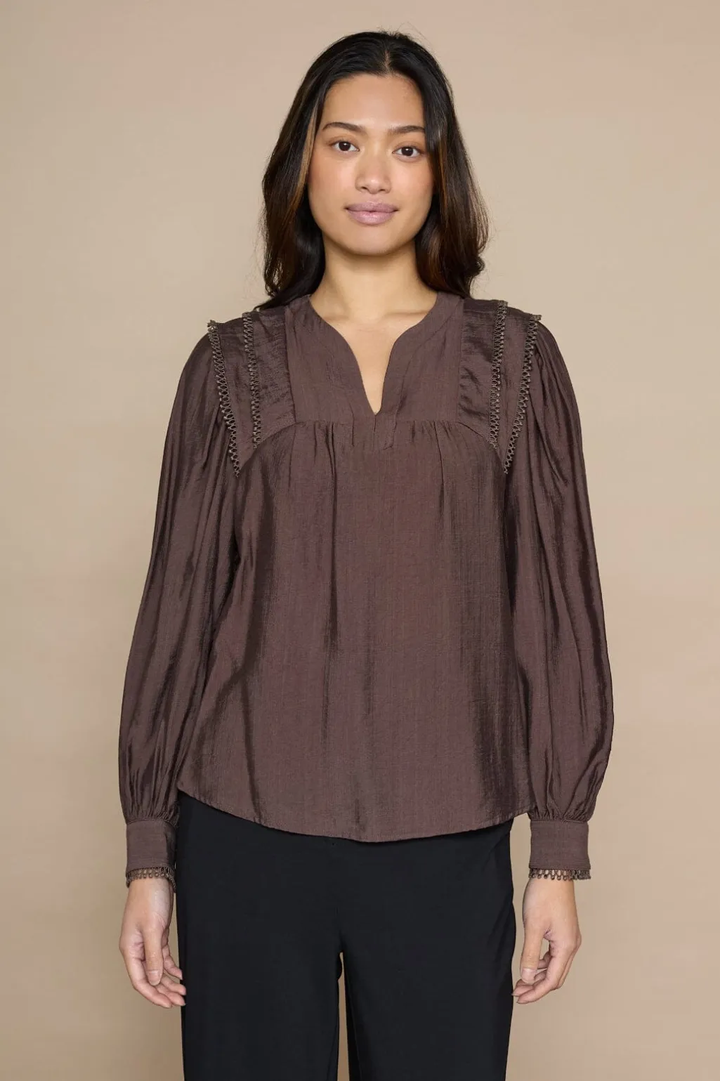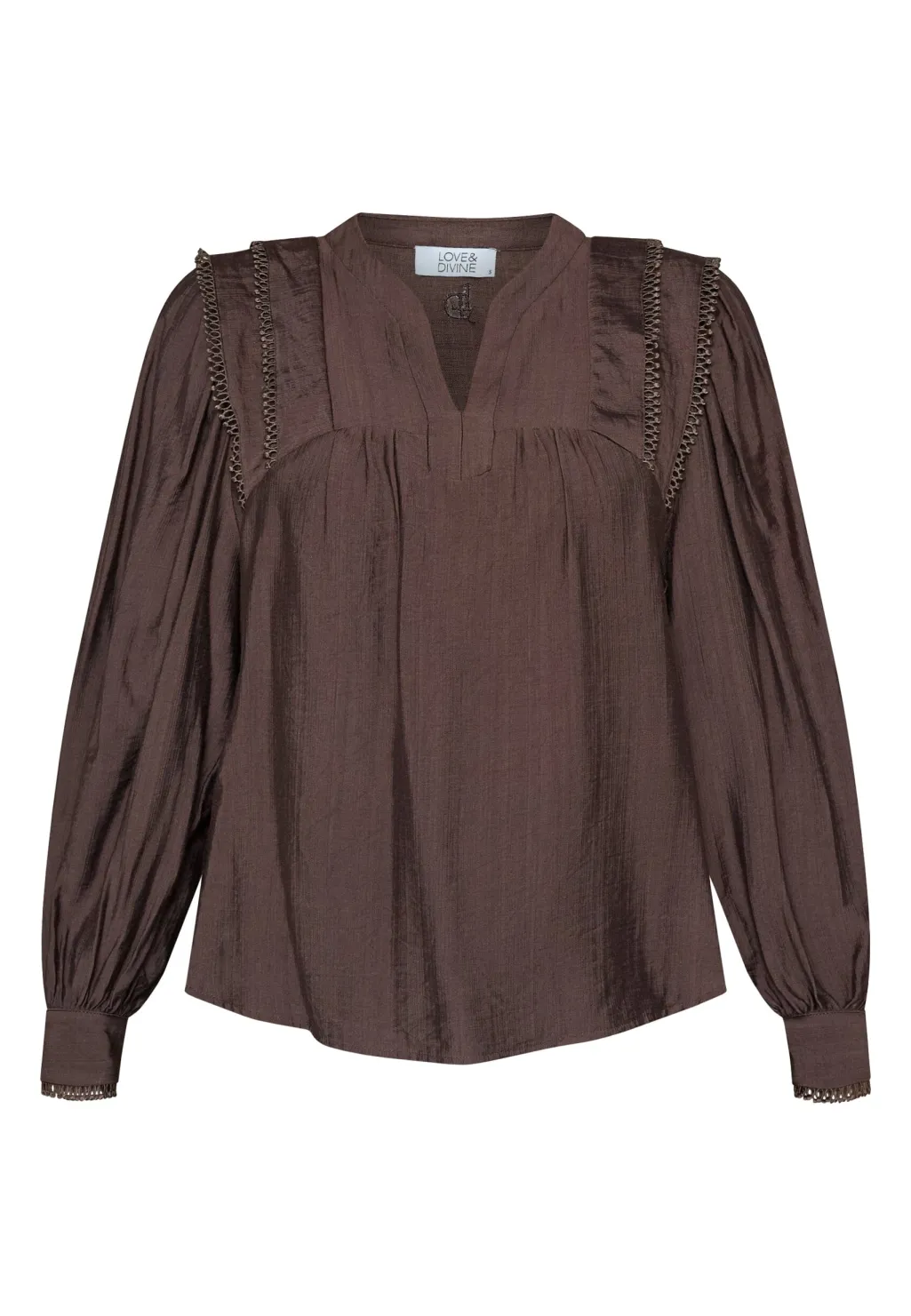 Mørkebrun bluse fra Love & Divine, lavet af en blanding af viscose og polyamid. Blusen har en V-hals og lange ærmer.