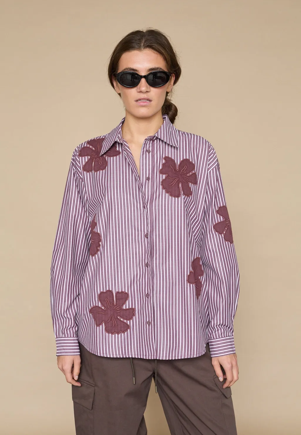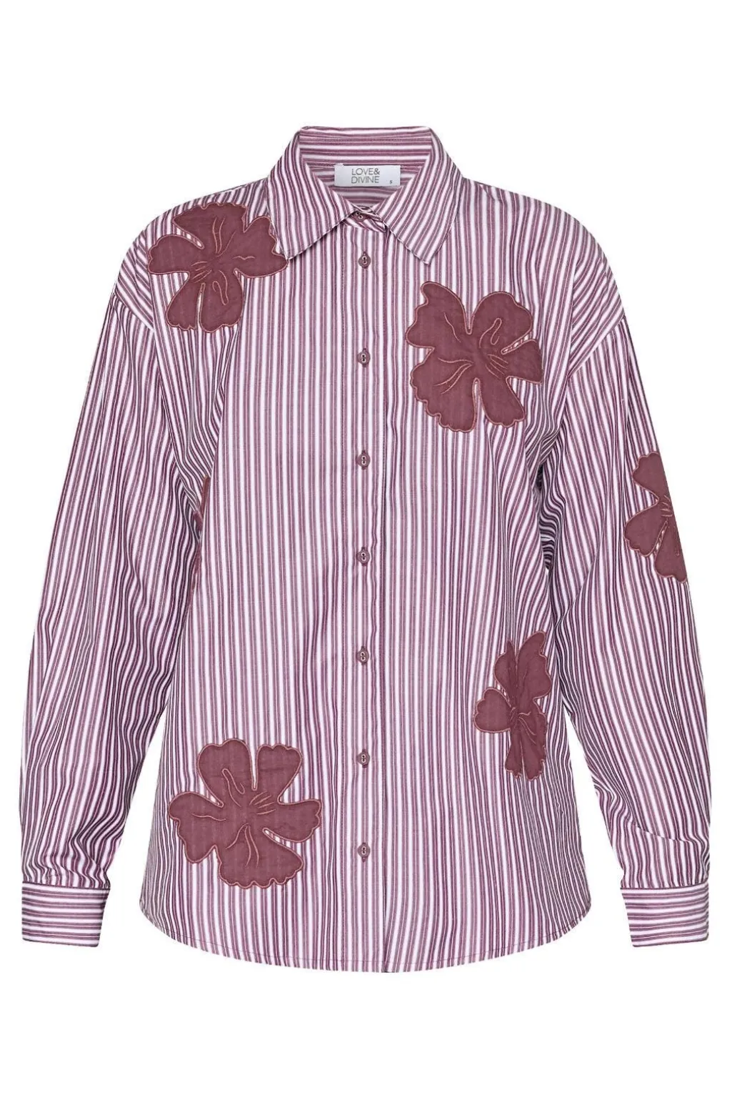 Stribet skjorte fra Love & Divine med store blomsterapplikationer i bordeaux. Skjorten har klassisk krave og knaplukning.