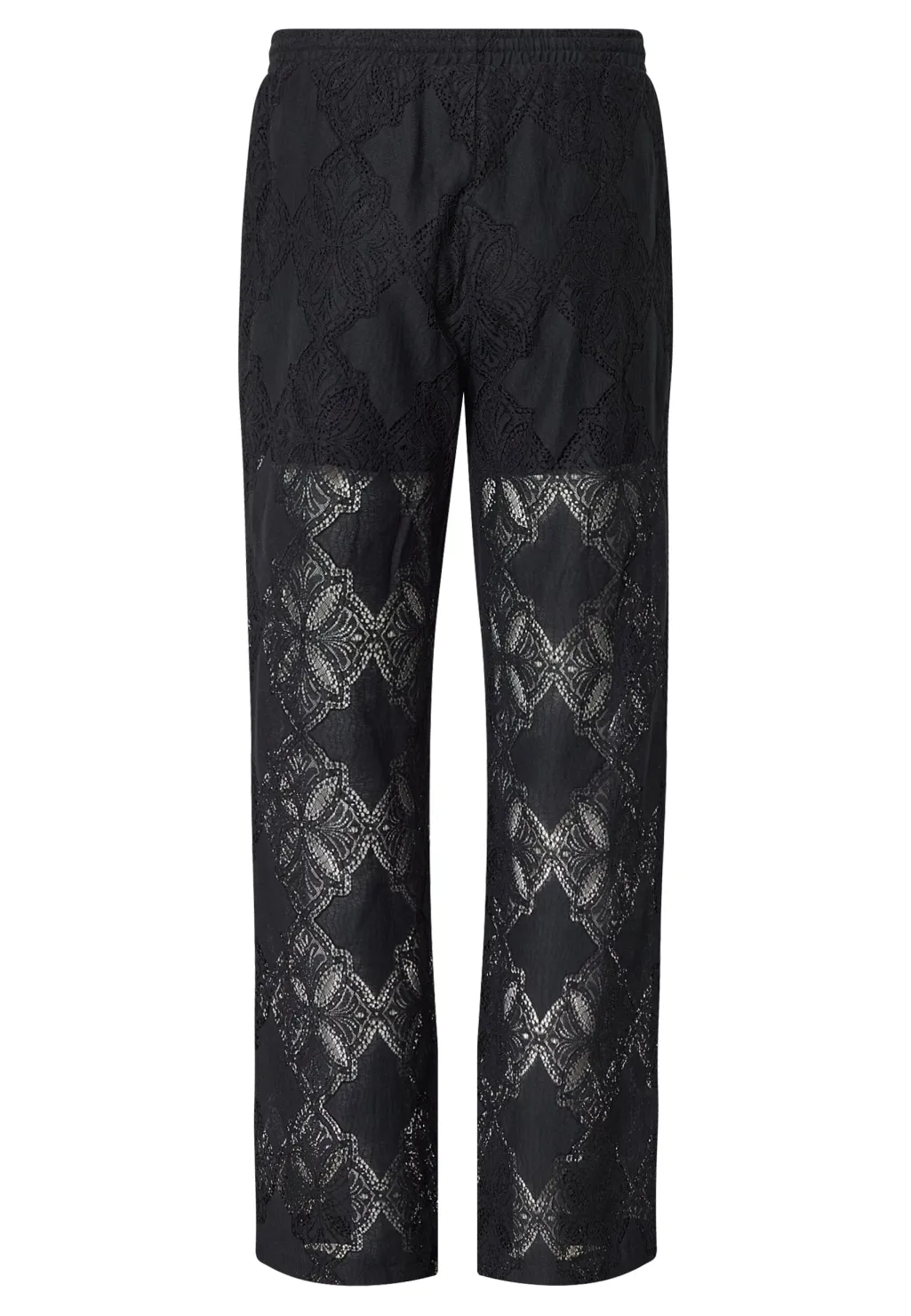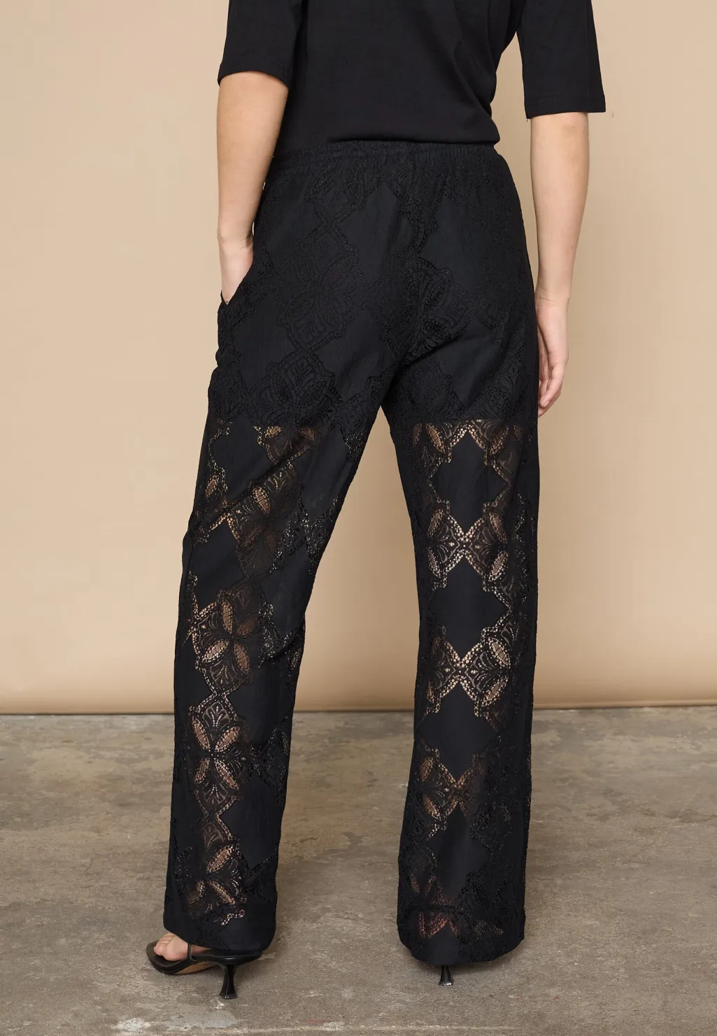Sorte bukser fra Love & Divine med gennemsigtigt blondemønster. Bukserne har en almindelig taljehøjde og går til anklen.