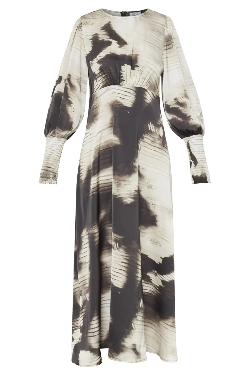 Grafisk kjole fra Love & Divine med et sort-hvidt mønster. Kjolen har lange ærmer, rund halsudskæring og går til midt på læggen.