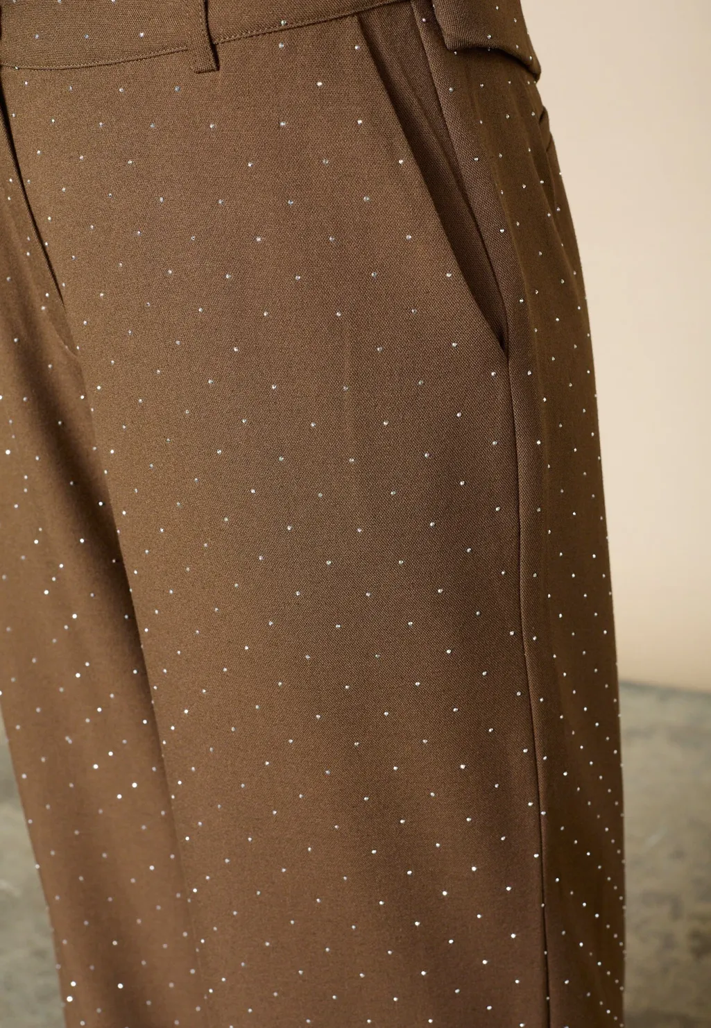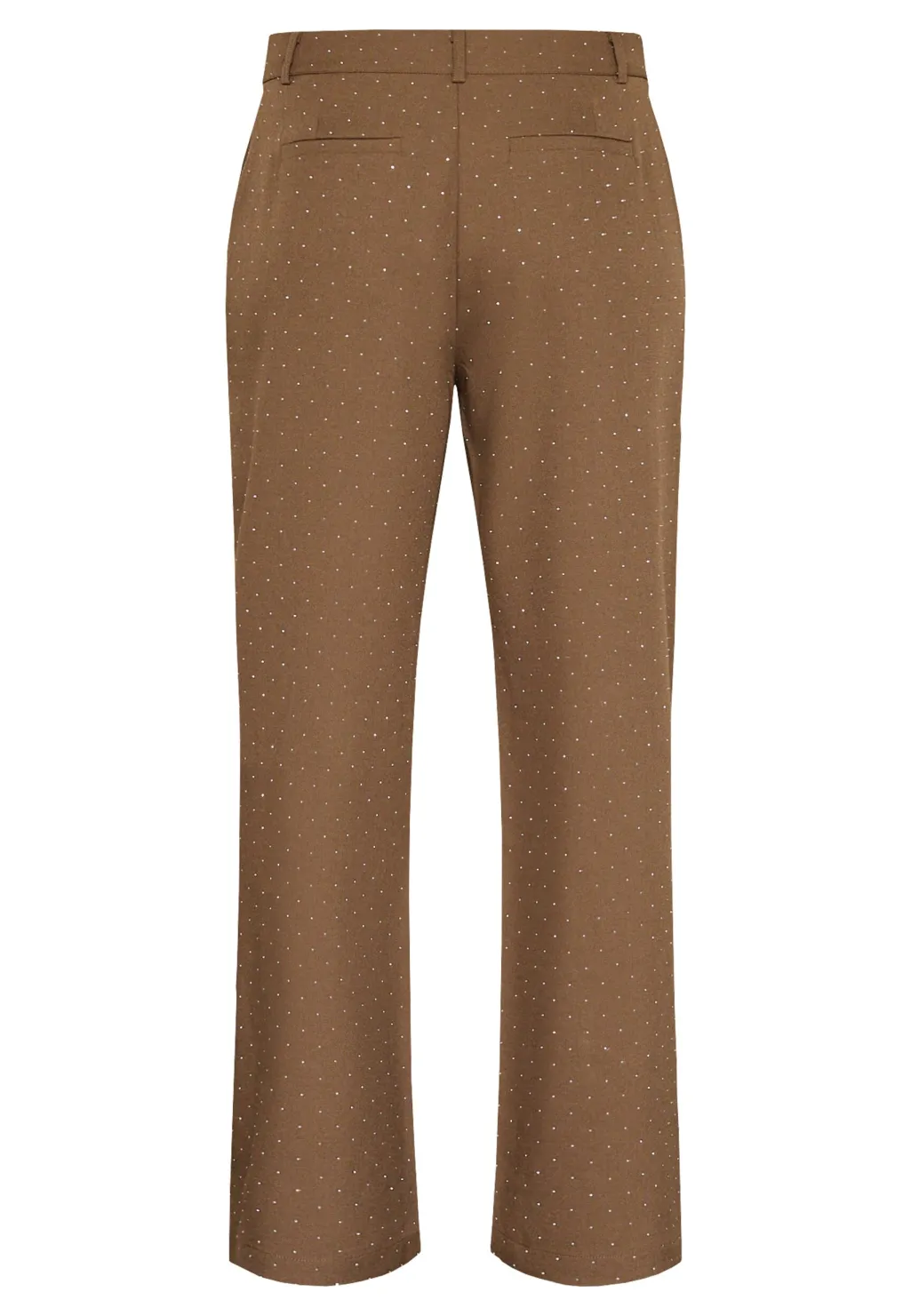Brune bukser fra Love & Divine med små rhinestone-detaljer over hele stoffet. Bukserne er en del af et jakkesæt med en matchende blazer.