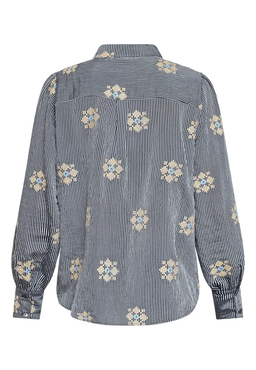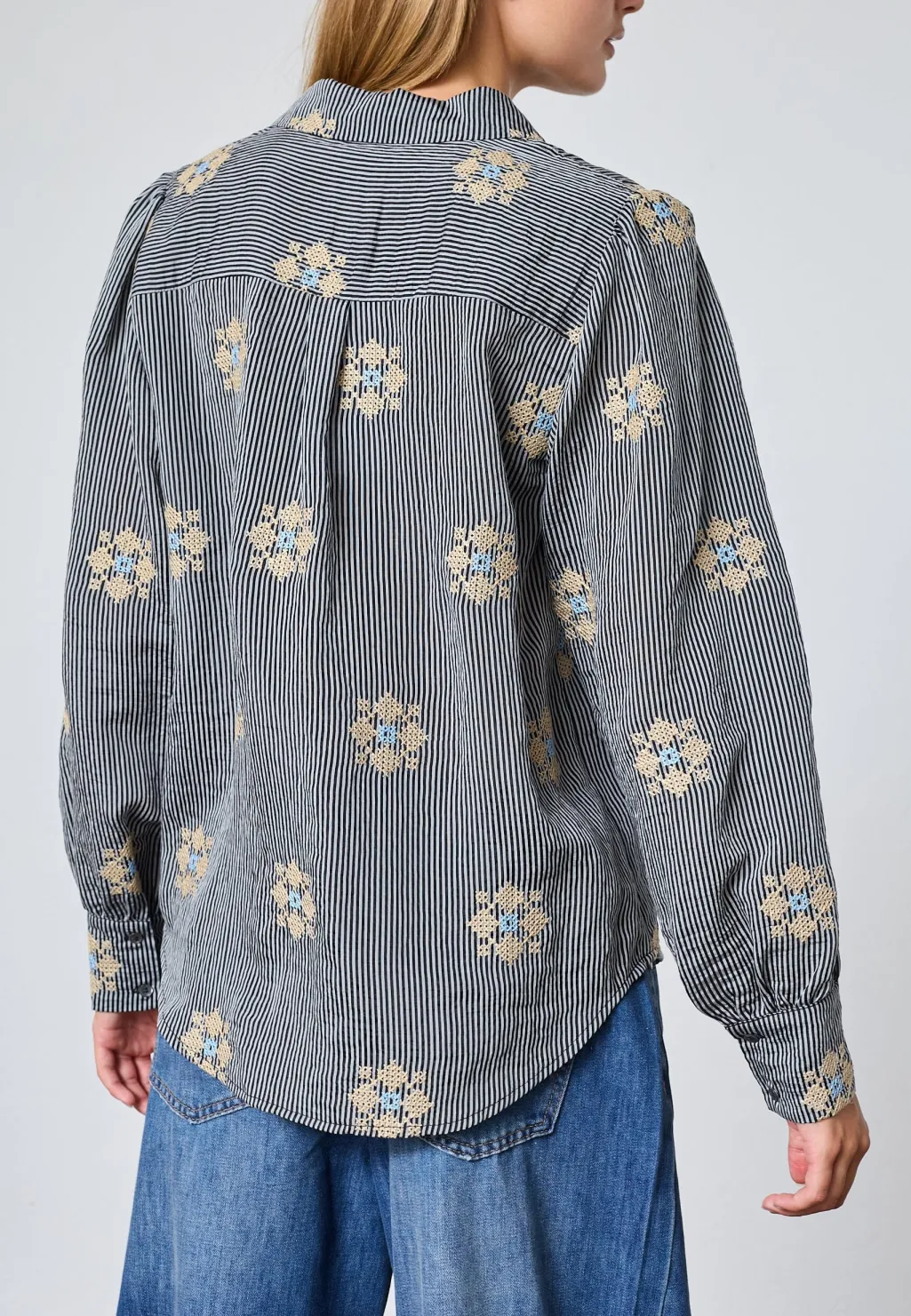 Stribet skjorte fra Love & Divine med sorte og hvide striber. Skjorten har broderede blomsterdetaljer, der skaber kontrast til det stribede mønster.