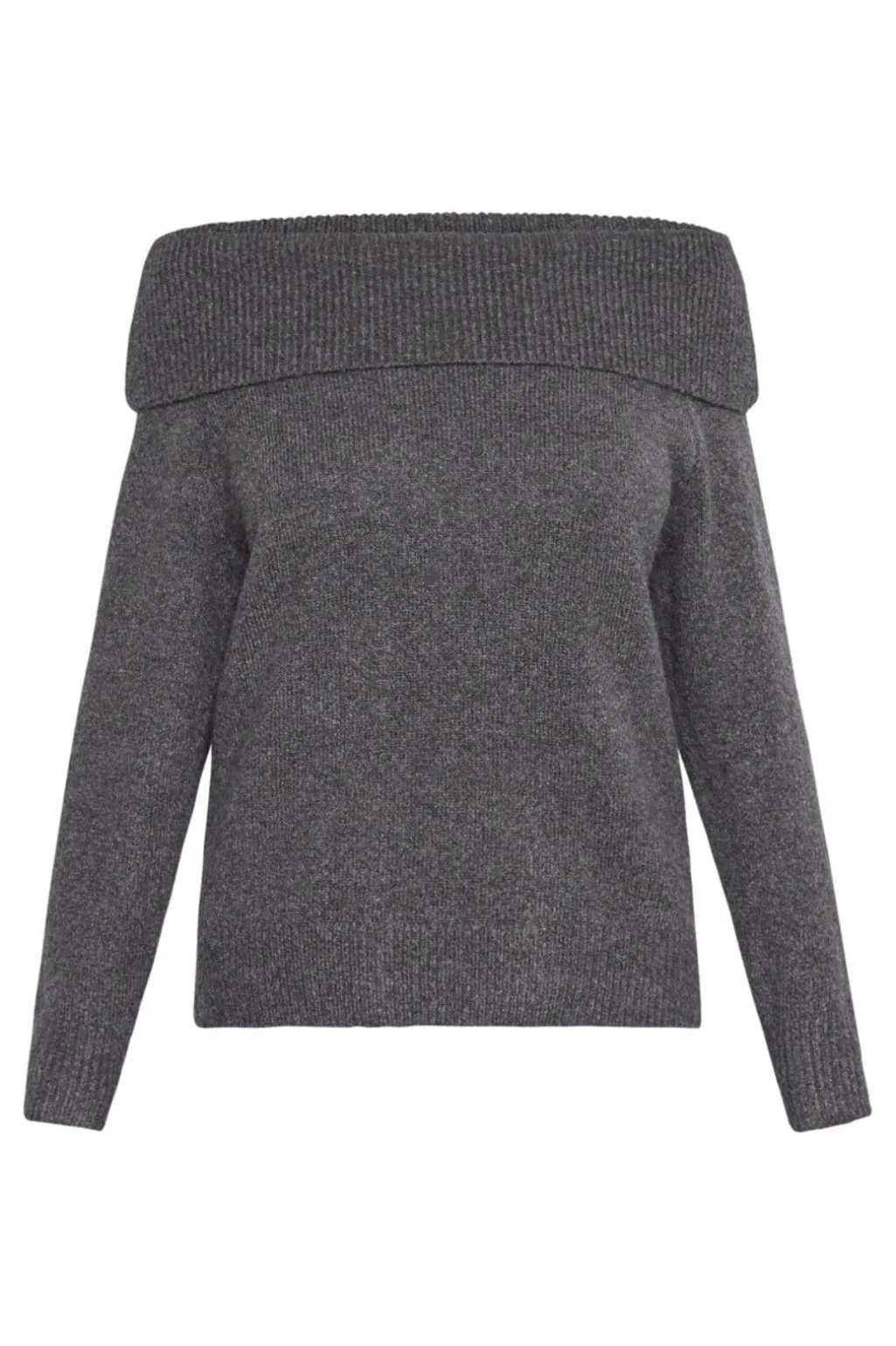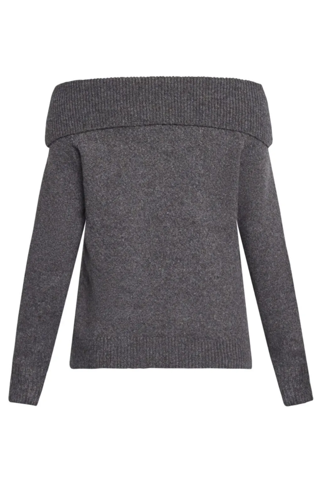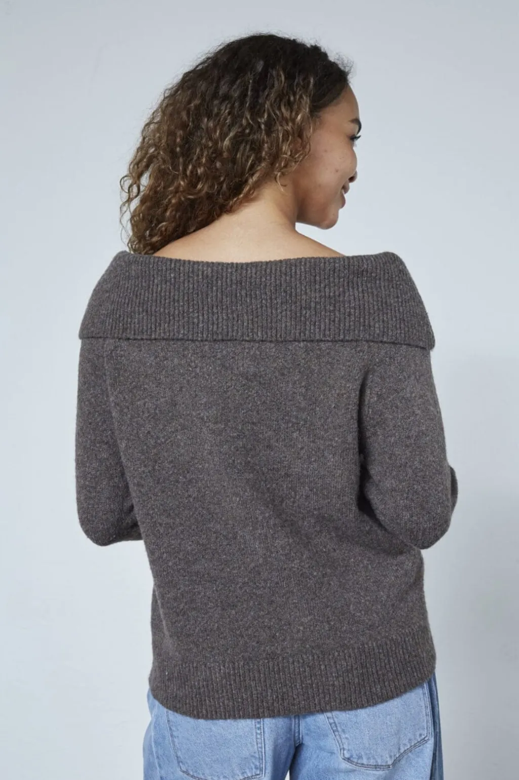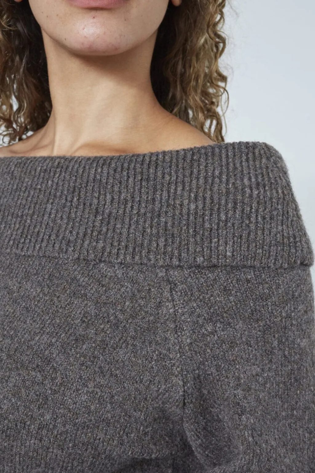Brun strikket sweater fra Sisters Point med off-shoulder-design og lange ærmer. Den har en bred ribkant ved halsudskæringen og et meleret mønster.