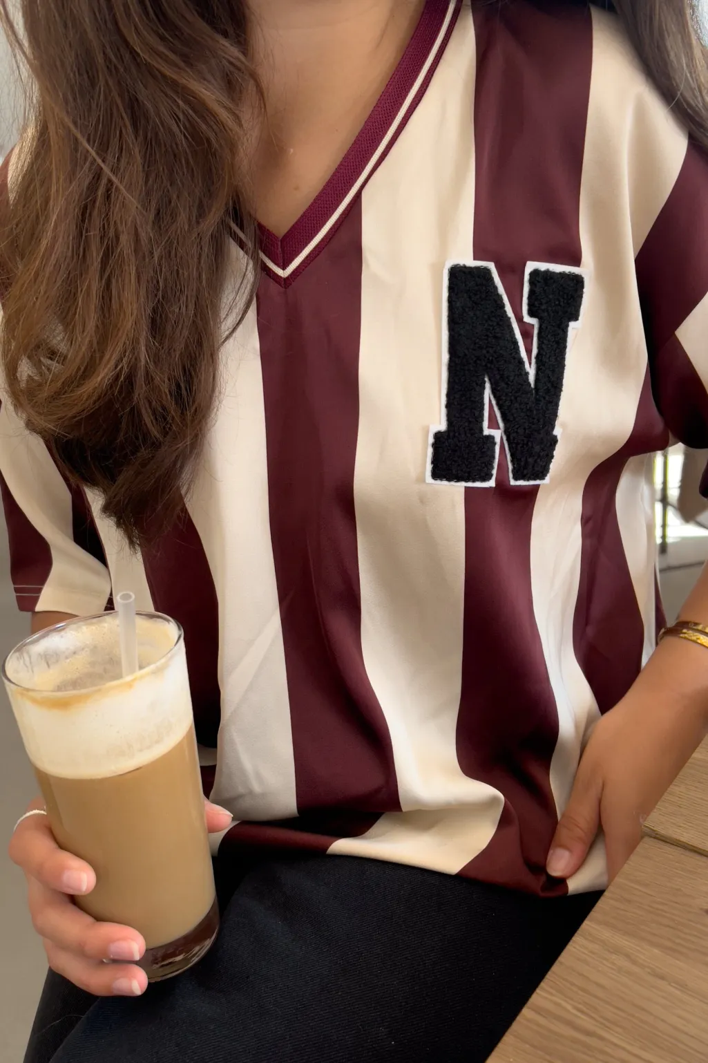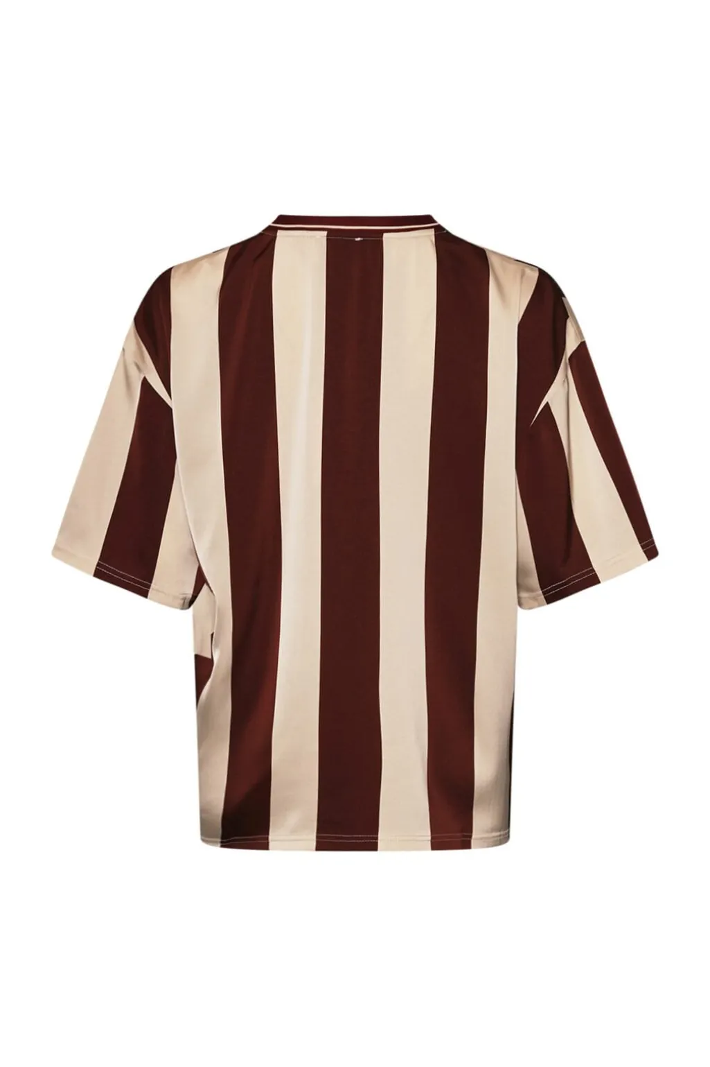 Stribet bluse fra Noella i mørkerøde og cremefarvede striber. Blusen har broderi på brystet og en V-hals.