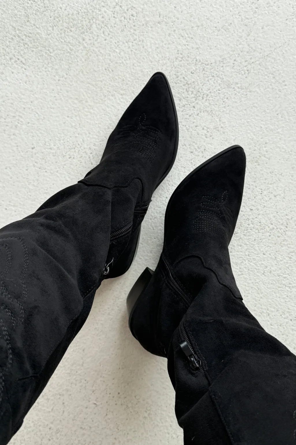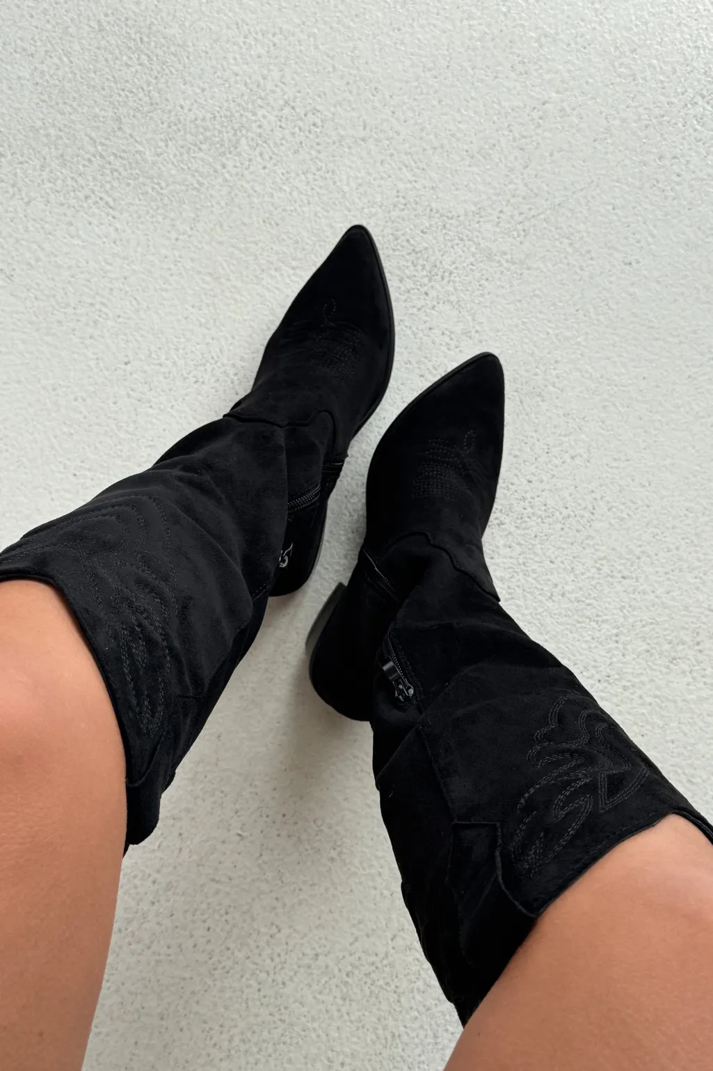 Sort støvle fra Bloom med blokhæl. Støvlen har en hælhøjde på 5-8 cm og en mandelformet snude. Den passer til både hverdag og fest.