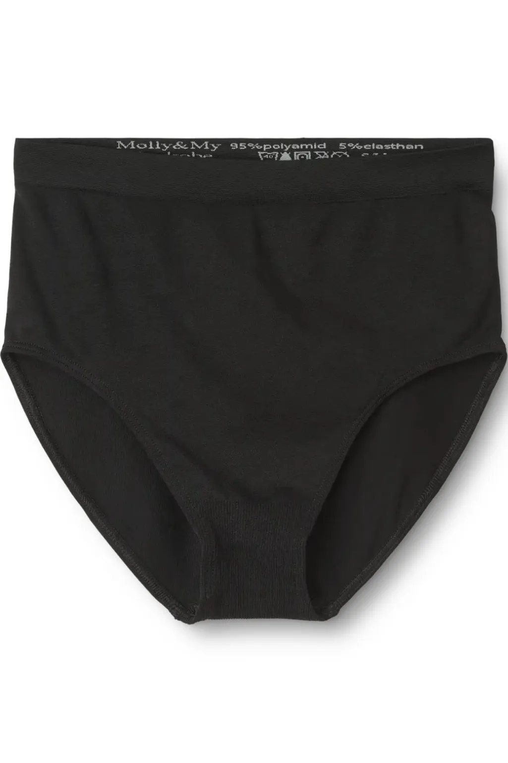 Sorte højtaljede trusser med glat overflade. Den brede elastiske talje og det højtaljede design giver god støtte og dækning.