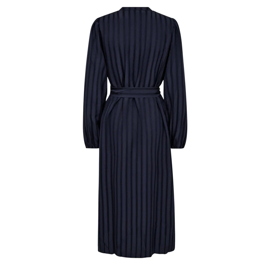Mørkeblå kjole fra Co´couture med striber. Kjolen har smockede skuldre, knaplukning foran og et bælte i taljen. Den kalvelange model har V-udskæring og lange ærmer.