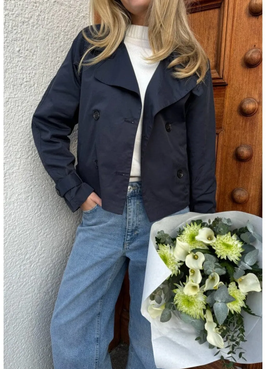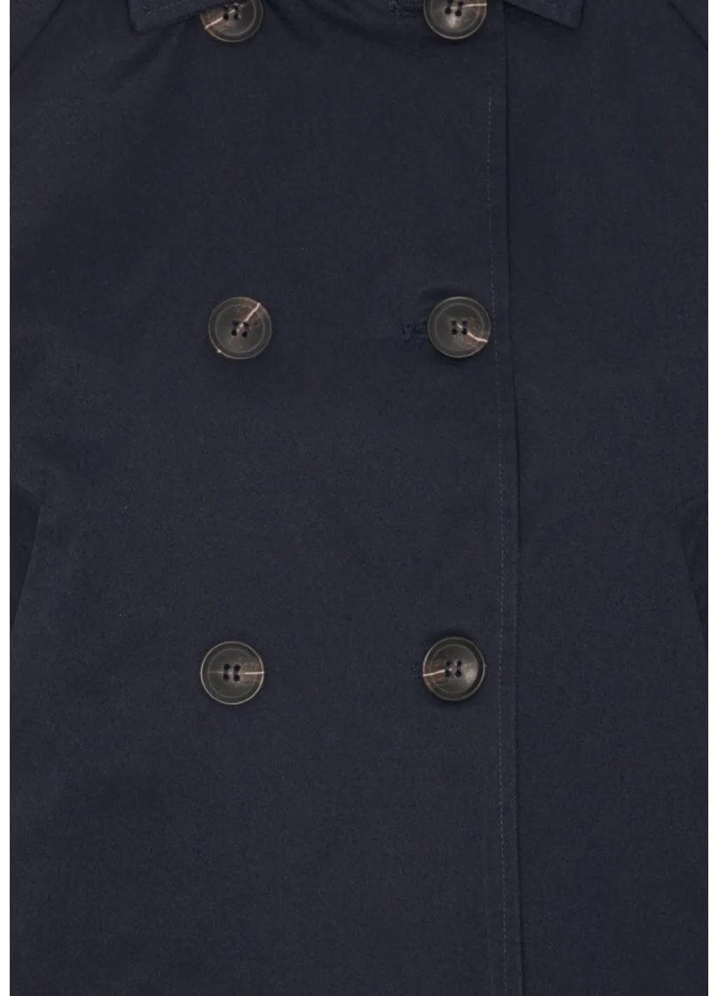 Mørkeblå trenchcoat fra BYIC med skjortekrave og lange ærmer. Den har praktiske knapper og lommer, der gør den brugbar til mange anledninger.