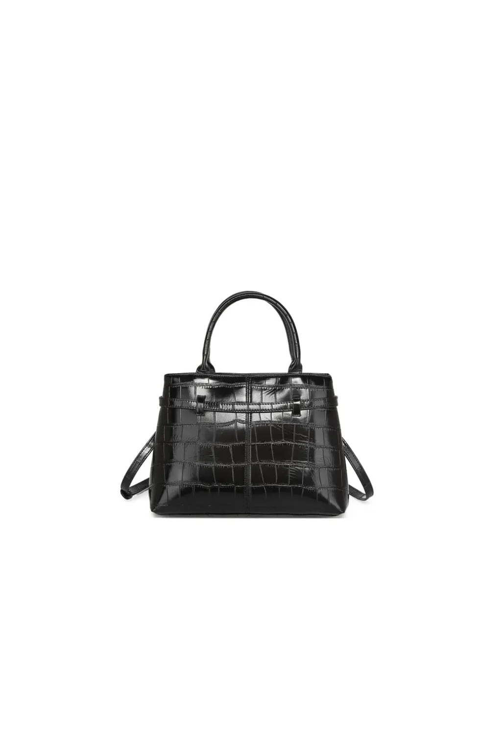 Sort taske fra Noella med krokodillemønster på overfladen. Tasken har to håndtag og en aftagelig skulderrem med bælte-detalje.