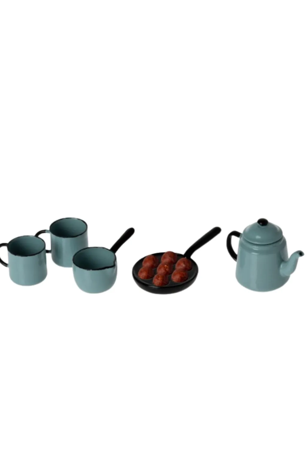 Miniature madlavningssæt med alle Madam Blå’s favoritter. En smuk kande til kaffe, to kopper, en grydeske og en pande med lækre æbleskiver, som er en traditionel skandinavisk godte i den kolde vintertid. Kommer i en papæske designet som et komfur.