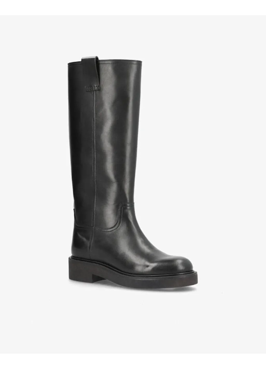 Sort læderstøvle fra Phenumb Copenhagen med et højt skaft, der når op til midten af læggen. Støvlen har en rund tåform og en solid sål.