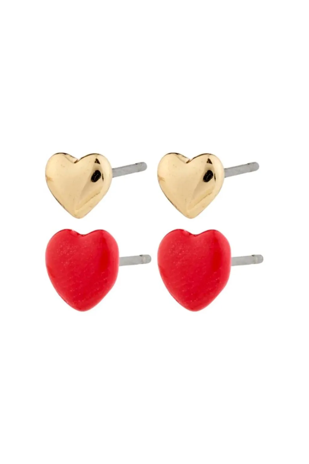 Øreringe fra Pilgrim i to par: et guldbelagt og et rødt med emalje. Begge par har hjerteform og måler 5/8 millimeter. Smykkerne er lavet med omtanke for miljøet.