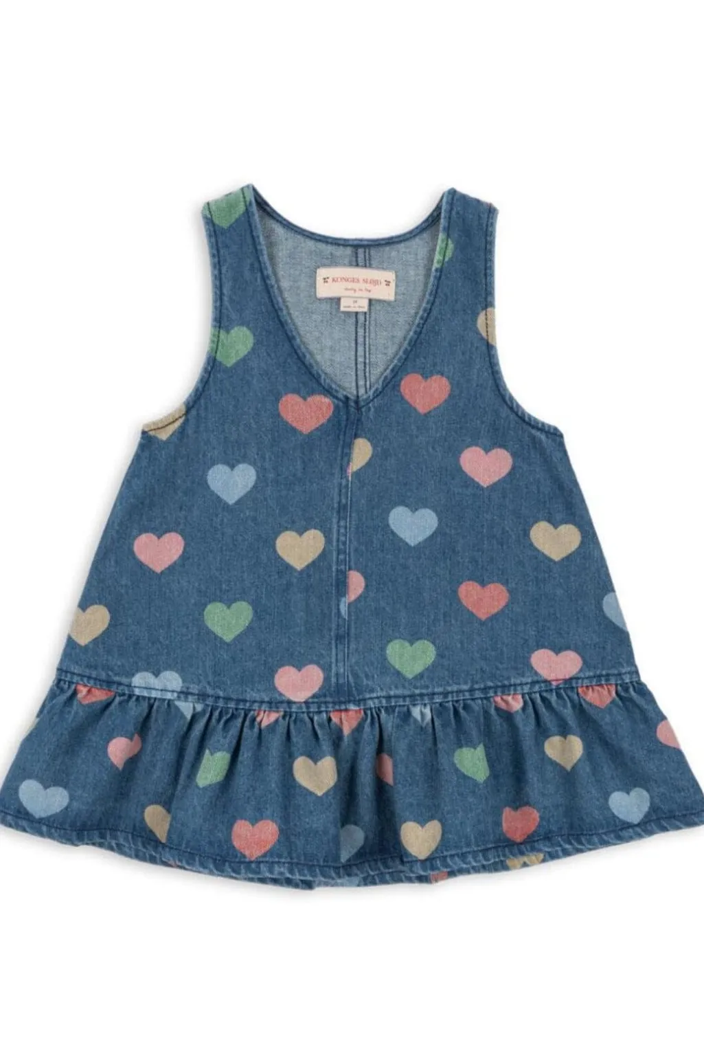 Kjole fra Konges Sløjd, lavet af 100 % økologisk bomuld. Det flerfarvede hjerteprint på blå baggrund giver kjolen et charmerende udtryk.